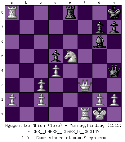 Last move : 1-0 2010 June 2 1:32:43 [Event "FICGS__CHESS__CLASS_D__000149"] [Site "FICGS"] [Date "2010.05.21"] [Round "1"] [White "Nguyen,Hao Nhien"] [Black "Murray,Findlay"] [Result "1-0"] [WhiteElo "1575"] [BlackElo "1515"] 1.e4 e5 2.Nc3 Nf6 3.f4 d5 4.d3 exf4 5.e5 d4 6.exf6 dxc3 7.Qe2+ Be6 8.bxc3 Qxf6 9.d4 Be7 10.Nh3 O-O 11.Bxf4 c6 12.Bg5 Qg6 13.Bxe7 Re8 14.Nf4 Qh6 15.Bd6 Bd7 16.Be5 f6 17.Nd3 fxe5 18.Nxe5 Bf5 19.Qf3 Bg6 20.Bc4+ Kh8 21.O-O Na6 22.Rab1 Nc7 23.Rxb7 Nd5 24.Bxd5 cxd5 25.Rxa7 Qh4 26.Rxa8 1-0 Vienna gambit, Steinitz variation Kingside Castling by player Black (move 10) Kingside Castling by player White (move 21) Player White won this chess game. Follow this game move after move (download)At this time Fischer is simply a level above all the best Chessplayers in the world. (John Jacobs) Im Schach gibt es keinen Platz für Galanterie. (Irving Chernev) Cuando la partida de Ajedrez termina, el Peón y el Rey regresan a la misma caja. (Irish saying) L'ordinateur a tué l'originalité. Il n'y a plus guère d'aventures sur l'échiquier. (Jacob Murray) I can't decide which is riskier; taking crazy risks, or taking advice on crazy risks from a crazy risk taker. (Gregory House in House M.D.)