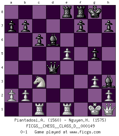 Last move : 0-1 2010 June 18 23:4:36 [Event "FICGS__CHESS__CLASS_D__000149"] [Site "FICGS"] [Date "2010.05.21"] [Round "1"] [White "Piantadosi,Angelo"] [Black "Nguyen,Hao Nhien"] [Result "0-1"] [WhiteElo "1560"] [BlackElo "1575"] 1.d4 d5 2.c4 e6 3.Nc3 Nf6 4.cxd5 exd5 5.Bg5 Bf5 6.Bxf6 Qxf6 7.Nxd5 Qc6 8.Nc3 Bb4 9.Rc1 O-O 10.Nf3 Nd7 11.e3 Bg4 12.Be2 Rae8 13.O-O Qh6 14.Nd5 Bd6 15.g3 c6 16.Nc3 Nf6 17.Nh4 Bh3 18.Re1 g5 19.Bf1 Bxf1 20.Nf5 Qh3 21.Qf3 Ng4 22.Qh1 Nxf2 23.Kxf2 Qxf5+ 24.Kg1 Bh3 25.e4 Qg4 26.e5 Qxd4+ 0-1 QGD : Exchange, positional line Kingside Castling by player Black (move 9) Kingside Castling by player White (move 13) Player Black won this chess game. Follow this game move after move (download)A sacrifice is best refuted by accepting it. (Wilhelm Steinitz) Modernes Schach sorgt sich zuviel um Dinge wie Bauernstruktur usw. Vergessen Sie das, Schachmatt beendet das Spiel! (Nigel Short) Prefiero perder una partida realmente buena, que ganar una mala. (David Levy) Dans le domaine de la peinture, de la gravure et de la sculpture, dès la première décennie de notre siècle, les artistes abandonnent la représentation de la partie d'échecs pour se concentrer sur les pièces, sur les échiquiers et sur toutes les variations auxquelles les unes et les autres peuvent donner lieu. On passe en quelque sorte d'un thème social à un thème musical (au sens de la musica médiévale, c'est-à-dire d'une notion qui inclue le rythme, l'harmonie, la construction et la déconstruction, etc.). Graphiquement et picturalement, l'échiquier apparaît comme une structure ouverte, dynamique, d'une richesse infinie, autorisant toutes les combinatoires et débouchant sur des mouvements et des rythmes de nature exponentielle. (Michel Pastoureau) There are two major products that came out of Berkeley: LSD and UNIX. We do not believe this is to be a coincidence. (Jeremy S. Anderson)