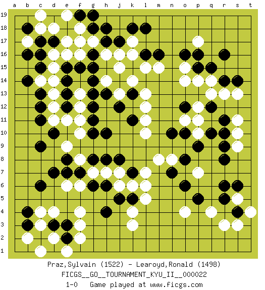 Last move : 1-0 2010 October 4 17:40:20 [Event "FICGS__GO__TOURNAMENT_KYU_II__000022"] [Site "FICGS"] [Date "2010.05.21"] [Round "1"] [Black "Praz,Sylvain"] [White "Learoyd,Ronald"] [Result "1-0"] [Rating 1 "1522"] [Rating 2 "1498"] 1.r16 d4 2.d17 q4 3.c6 f4 4.b4 c3 5.c9 p17 6.m16 p14 7.p15 o15 8.q15 o14 9.o16 q14 10.r14 r13 11.s14 s13 12.p16 k3 13.r6 o4 14.s4 r3 15.r9 d15 16.c15 d16 17.c16 e17 18.c17 d14 19.c13 s3 20.q12 q13 21.o12 s11 22.r11 s10 23.r10 s9 24.r8 s5 25.s6 t4 26.f15 f16 27.k5 k4 28.g16 g17 29.g15 h16 30.h17 j16 31.j17 k16 32.g18 f17 33.l18 k17 34.k18 m15 35.l16 l15 36.j14 c14 37.b14 d13 38.c12 k14 39.g12 d12 40.c11 e11 41.j12 l12 42.h10 e9 43.e7 f8 44.h8 g7 45.h6 h7 46.g6 j7 47.k7 j6 48.j5 k6 49.h4 f6 50.f7 e6 51.d7 l5 52.g8 f10 53.j8 l6 54.d10 f12 55.g13 f13 56.e15 e16 57.g10 f18 58.h18 d18 59.f19 e19 60.g19 c18 61.b18 c19 62.b3 b2 63.e3 f3 64.d3 c4 65.e2 f2 66.c2 c1 67.d1 d2 68.e14 e1 69.e13 p10 70.n10 l10 71.k13 l13 72.k11 h14 73.h13 j15 74.g14 j13 75.e12 d11 76.j14 b17 77.b16 j13 78.g11 f11 79.e8 l11 80.n7 l7 81.p5 o11 82.p9 p12 83.o10 p7 84.q10 p11 85.o6 n8 86.o8 m8 87.r5 1-0 Here are the names of the openings (joseki) played in the four corners : Corner d4 : d4 c6 Hoshi (Hwajeom, Seongjeom, Xingwei`) 4-4 Point. The star or hoshi (4-4) point, emphasizing influence at the potential expense of territory. Ikken Kakari (Hankan Keolch'im, Yi Gua`jiao~, 1-Space Low Approach). Black 2 is the standard approach move to the 4-4. Corner q16 : r16 p17 Komoku (Somok, Xiao~mu`) 3-4 Point. The komoku (3-4) point is the traditional corner enclosure move.. Ikken Kakari (Hankan Keolch'im, Yi Gua`jiao~, 1-Space Low Pincer). The small knight move is the basic approach move to the 3-4 point stone. It has been continually used for over four centuries. There are limitless variations, with new moves constantly being discovered. White 2 opens the door to a treaure store of joseki. Corner q4 : q4 r6 Hoshi (Hwajeom, Seongjeom, Xingwei`) 4-4 Point. The star or hoshi (4-4) point, emphasizing influence at the potential expense of territory. Ikken Kakari (Hankan Keolch'im, Yi Gua`jiao~, 1-Space Low Approach). Black 2 is the standard approach move to the 4-4. Corner d16 : d17 d15 Komoku (Somok, Xiao~mu`) 3-4 Point. The komoku (3-4) point is the traditional corner enclosure move.. Ikken Takagakari (Hankan Nop'dakeolch'im, Yi Gaogua`jiao~, 1-Space High Approach). The 5-4 approach move has become more popular in modern times, as modern Go emphasizes speed and influence. Player Black won this Go (weiqi, baduk) game. Follow this game move after move (download)Strike at the waist of the knight's move. (Anonymous) No, no, you're not thinking; you're just being logical. (Niels Bohr)