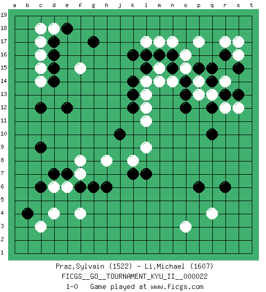 Last move : 1-0 2010 October 7 21:27:41 [Event "FICGS__GO__TOURNAMENT_KYU_II__000022 "] [Site "FICGS"] [Date "2010.05.21"] [Round "1"] [Black "Praz,Sylvain "] [White "Li,Michael "] [Result "1-0"] [Rating 1 "1522"] [Rating 2 "1607"] 1.r16 d4 2.d17 q4 3.c6 f4 4.b4 c3 5.c9 c15 6.c12 f15 7.g17 c17 8.d16 c16 9.d15 d18 10.e18 c18 11.d14 c14 12.r6 o3 13.q10 p17 14.m16 p14 15.p15 o15 16.q15 o16 17.o14 n14 18.o13 m15 19.k16 r14 20.q14 p13 21.o12 q13 22.r13 r12 23.s13 s12 24.q12 r17 25.p6 s16 26.s15 s17 27.l15 l14 28.k14 l13 29.e12 l17 30.l16 m17 31.n16 n17 32.n15 m14 33.k13 l12 34.k12 l11 35.j10 l9 36.l7 k8 37.k7 h8 38.h6 f8 39.f6 d6 40.d7 e6 41.e7 f7 42.g6 1-0 This go game has been lost on time (started : 2010.05.21 23:42:30) Here are the names of the openings (joseki) played in the four corners : Corner d4 : d4 c6Hoshi (Hwajeom, Seongjeom, Xingwei`) 4-4 Point. The star or hoshi (4-4) point, emphasizing influence at the potential expense of territory.Ikken Kakari (Hankan Keolch'im, Yi Gua`jiao~, 1-Space Low Approach). Black 2 is the standard approach move to the 4-4. Corner d16 : d17 c15Komoku (Somok, Xiao~mu`) 3-4 Point. The komoku (3-4) point is the traditional corner enclosure move..Ikken Kakari (Hankan Keolch'im, Yi Gua`jiao~, 1-Space Low Pincer). The small knight move is the basic approach move to the 3-4 point stone. It has been continually used for over four centuries. There are limitless variations, with new moves constantly being discovered. White 2 opens the door to a treaure store of joseki. Corner q4 : q4 r6Hoshi (Hwajeom, Seongjeom, Xingwei`) 4-4 Point. The star or hoshi (4-4) point, emphasizing influence at the potential expense of territory.Ikken Kakari (Hankan Keolch'im, Yi Gua`jiao~, 1-Space Low Approach). Black 2 is the standard approach move to the 4-4. Corner q16 : r16 p17Komoku (Somok, Xiao~mu`) 3-4 Point. The komoku (3-4) point is the traditional corner enclosure move..Ikken Kakari (Hankan Keolch'im, Yi Gua`jiao~, 1-Space Low Pincer). The small knight move is the basic approach move to the 3-4 point stone. It has been continually used for over four centuries. There are limitless variations, with new moves constantly being discovered. White 2 opens the door to a treaure store of joseki. Player Black won this Go (weiqi, baduk) game.Follow this game move after move (download ) If a formation is symmetrical, play at the center. (Anonymous) Whenever people agree with me, I always feel I must be wrong. (Oscar Wilde)