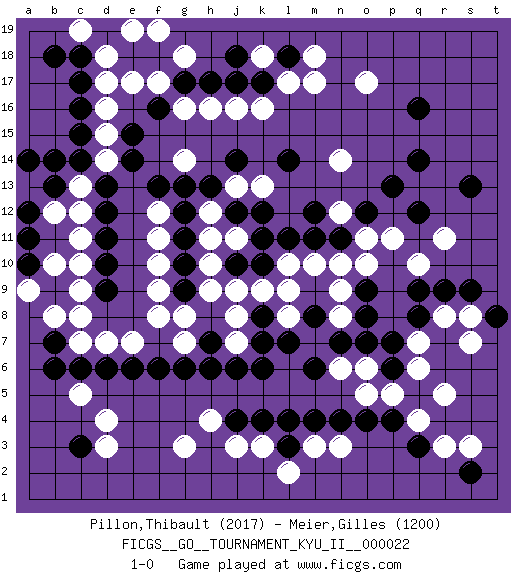 Last move : 1-0 2010 September 13 17:10:55 [Event "FICGS__GO__TOURNAMENT_KYU_II__000022"] [Site "FICGS"] [Date "2010.05.21"] [Round "1"] [Black "Pillon,Thibault"] [White "Meier,Gilles"] [Result "1-0"] [Rating 1 "2017"] [Rating 2 "1200"] 1.q16 d4 2.q3 d16 3.q9 o17 4.q14 l17 5.k4 g3 6.c14 c12 7.e14 g16 8.d11 c11 9.d10 c10 10.d9 c8 11.d12 r5 12.p4 r8 13.r9 s8 14.s9 s3 15.c17 d17 16.c16 n14 17.c6 c5 18.d6 n3 19.n4 m3 20.m4 k3 21.l3 l2 22.l4 j3 23.b7 b8 24.b13 b12 25.a10 c7 26.b6 d7 27.e6 e7 28.f6 f8 29.j4 h4 30.h6 c13 31.d13 g14 32.g10 f10 33.g11 f11 34.g9 f9 35.g12 f12 36.f13 g7 37.g6 g8 38.k10 d15 39.b14 d14 40.g13 j8 41.k6 l8 42.k8 k9 43.k7 j9 44.k12 l10 45.l11 m10 46.m11 n10 47.n11 o11 48.o12 p11 49.p13 r11 50.q8 q7 51.o8 n8 52.o9 o10 53.p7 q6 54.t8 s7 55.s13 n9 56.n7 m7 57.l7 n6 58.o7 o6 59.p6 o5 60.q5 p5 61.m6 q4 62.m8 l9 63.c18 j11 64.j10 h10 65.k11 a9 66.o4 b10 67.a11 c9 68.a12 a13 69.e18 d18 70.d19 f17 71.s2 r3 72.c3 d3 73.h17 h16 74.j17 j16 75.e15 e17 76.k17 k16 77.l18 m17 78.f18 k18 79.j18 g18 80.g17 f19 81.f16 m18 82.a14 q10 83.q12 e19 84.c15 c19 85.b18 j7 86.j6 h9 87.h7 h11 88.j12 h12 89.h13 j13 90.j14 k13 91.l14 n12 92.m12 1-0 Here are the names of the openings (joseki) played in the four corners : Corner q16 : q16 o17 Hoshi (Hwajeom, Seongjeom, Xingwei`) 4-4 Point. The star or hoshi (4-4) point, emphasizing influence at the potential expense of territory. Ikken Kakari (Hankan Keolch'im, Yi Gua`jiao~, 1-Space Low Approach). White 2 is the standard approach move to the 4-4. Corner d16 : d16 c14 Hoshi (Hwajeom, Seongjeom, Xingwei`) 4-4 Point. The star or hoshi (4-4) point, emphasizing influence at the potential expense of territory. Ikken Kakari (Hankan Keolch'im, Yi Gua`jiao~, 1-Space Low Approach). Black 2 is the standard approach move to the 4-4. Player Black won this Go (weiqi, baduk) game. Follow this game move after move (download)One big eye kills one small eye. (Anonymous) As a goal marker shodan is important. As a destination it is a poor place to stop. (Thomas Tamayo)
