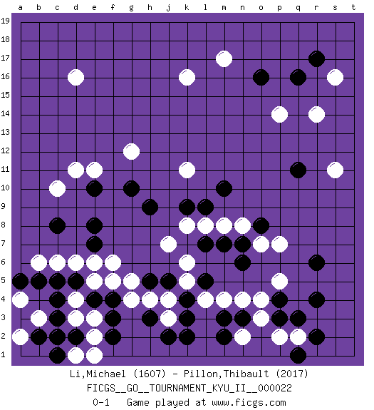Last move : 0-1 2010 October 10 21:38:0 [Event "FICGS__GO__TOURNAMENT_KYU_II__000022"] [Site "FICGS"] [Date "2010.05.21"] [Round "1"] [Black "Li,Michael"] [White "Pillon,Thibault"] [Result "0-1"] [Rating 1 "1607"] [Rating 2 "2017"] 1.q16 d4 2.q3 d16 3.f3 d6 4.k4 r14 5.q11 p14 6.o16 s16 7.r17 s11 8.r6 k16 9.c8 c10 10.e8 f6 11.c3 d3 12.d2 e2 13.c2 e3 14.b5 b6 15.c5 c6 16.c4 a4 17.a5 j3 18.k3 n4 19.f2 d1 20.h3 j4 21.j2 h4 22.k2 k11 23.e10 d11 24.h9 e11 25.g10 j7 26.k9 g12 27.l7 k8 28.l9 l8 29.m7 q2 30.r2 a2 31.c1 e1 32.a3 b3 33.b2 p2 34.p3 o3 35.p4 n2 36.m3 m8 37.n3 o4 38.q1 o7 39.n7 p5 40.r4 m4 41.m2 n8 42.o8 p7 43.n6 k5 44.l5 l4 45.j5 k6 46.h5 g4 47.f4 g5 48.d5 e5 49.e4 f5 50.e7 e6 51.m10 m17 0-1 This go game has been lost on time (started : 2010.05.21 23:42:30) Here are the names of the openings (joseki) played in the four corners : Corner d4 : d4 f3 Hoshi (Hwajeom, Seongjeom, Xingwei`) 4-4 Point. The star or hoshi (4-4) point, emphasizing influence at the potential expense of territory. Ikken Kakari (Hankan Keolch'im, Yi Gua`jiao~, 1-Space Low Approach). Black 2 is the standard approach move to the 4-4. Corner q16 : q16 r14 Hoshi (Hwajeom, Seongjeom, Xingwei`) 4-4 Point. The star or hoshi (4-4) point, emphasizing influence at the potential expense of territory. Ikken Kakari (Hankan Keolch'im, Yi Gua`jiao~, 1-Space Low Approach). White 2 is the standard approach move to the 4-4. Player White won this Go (weiqi, baduk) game. Follow this game move after move (download)In an unreasonable situation, an unreasonable move is reasonable. (Tamino) There is far too much law for those who can afford it and far too little for those who cannot. (Derek Bok)
