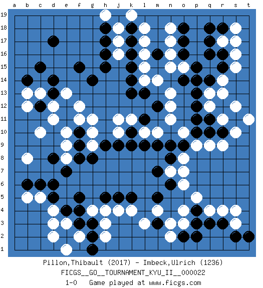 Last move : 1-0 2010 November 25 3:1:9 [Event "FICGS__GO__TOURNAMENT_KYU_II__000022"] [Site "FICGS"] [Date "2010.05.21"] [Round "1"] [Black "Pillon,Thibault"] [White "Imbeck,Ulrich"] [Result "1-0"] [Rating 1 "2017"] [Rating 2 "1236"] 1.q16 q4 2.d17 d4 3.c15 r14 4.k16 k4 5.q10 r11 6.q14 q13 7.r15 r13 8.p14 c10 9.c6 c5 10.d6 b8 11.f3 e3 12.f5 h3 13.e2 d2 14.e4 d3 15.d5 b5 16.b6 f2 17.c12 r9 18.r10 s10 19.s11 s12 20.m3 o4 21.m5 o6 22.p3 o3 23.p4 p5 24.q3 r4 25.r3 s3 26.s2 s4 27.o2 n2 28.p2 n3 29.t2 r17 30.q17 s15 31.r16 s17 32.r18 s18 33.q18 s16 34.k13 n13 35.p13 n11 36.q11 t11 37.p12 n15 38.k10 n17 39.n9 l17 40.k17 l18 41.k18 l14 42.k14 o10 43.o9 p9 44.p10 q9 45.o18 q12 46.p11 n18 47.o17 m10 48.o16 n16 49.d8 e10 50.m9 l10 51.l9 k11 52.j9 j10 53.k9 j11 54.h9 g11 55.f10 f11 56.e11 d11 57.e12 d12 58.d13 g10 59.f9 e13 60.g2 e1 61.g3 h2 62.g1 l3 63.k5 m4 64.j5 f12 65.f15 c13 66.d14 b13 67.b14 b12 68.n6 n7 69.m7 o8 70.n8 o7 71.g14 g9 72.g8 e9 73.f8 e8 74.e7 h4 75.h5 g4 76.f4 j4 77.l13 m14 78.m12 n12 79.l11 l15 80.m16 l16 81.k15 o15 82.p15 k19 83.o14 j18 84.h18 j17 85.h17 j16 86.h15 h19 87.h16 1-0 Here are the names of the openings (joseki) played in the four corners : Corner q16 : q16 r14 Hoshi (Hwajeom, Seongjeom, Xingwei`) 4-4 Point. The star or hoshi (4-4) point, emphasizing influence at the potential expense of territory. Ikken Kakari (Hankan Keolch'im, Yi Gua`jiao~, 1-Space Low Approach). White 2 is the standard approach move to the 4-4. Corner d4 : d4 c6 Hoshi (Hwajeom, Seongjeom, Xingwei`) 4-4 Point. The star or hoshi (4-4) point, emphasizing influence at the potential expense of territory. Ikken Kakari (Hankan Keolch'im, Yi Gua`jiao~, 1-Space Low Approach). Black 2 is the standard approach move to the 4-4. Player Black won this Go (weiqi, baduk) game. Follow this game move after move (download)Add one stone, then sacrifice both. (Anonymous) The real voyage of discovery consists not in seeking new lands but in seeing with new eyes. (Marcel Proust)