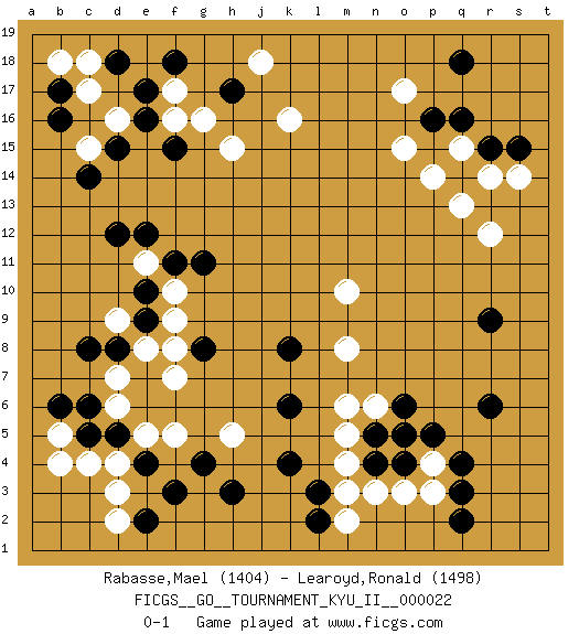 Last move : 0-1 2010 September 13 8:41:54 [Event "FICGS__GO__TOURNAMENT_KYU_II__000022"] [Site "FICGS"] [Date "2010.05.21"] [Round "1"] [Black "Rabasse,Mael"] [White "Learoyd,Ronald"] [Result "0-1"] [Rating 1 "1404"] [Rating 2 "1498"] 1.q16 d4 2.q4 d16 3.f3 d6 4.k4 o17 5.q14 k16 6.c8 d2 7.b6 b5 8.c5 b4 9.c6 c4 10.c14 f16 11.b16 c17 12.d12 r12 13.r9 s14 14.s15 r14 15.r15 q13 16.q18 p14 17.h17 h15 18.e17 f17 19.b17 b18 20.d18 c18 21.f18 j18 22.e16 c15 23.f15 g16 24.d15 q15 25.p16 o15 26.r6 o3 27.q2 d7 28.d8 e8 29.e9 f9 30.e10 f7 31.h3 m3 32.l2 m2 33.l3 m5 34.n4 m4 35.o4 p3 36.q3 p4 37.p5 o5 38.n5 n6 39.o6 n3 40.o5 m6 41.k6 m8 42.k8 m10 43.g8 f8 44.d5 e5 45.e4 f5 46.g11 h5 47.e2 d3 48.g4 f10 49.f11 e11 50.e12 d9 0-1 Here are the names of the openings (joseki) played in the four corners : Corner d4 : d4 f3 Hoshi (Hwajeom, Seongjeom, Xingwei`) 4-4 Point. The star or hoshi (4-4) point, emphasizing influence at the potential expense of territory. Ikken Kakari (Hankan Keolch'im, Yi Gua`jiao~, 1-Space Low Approach). Black 2 is the standard approach move to the 4-4. Corner q16 : q16 o17 Hoshi (Hwajeom, Seongjeom, Xingwei`) 4-4 Point. The star or hoshi (4-4) point, emphasizing influence at the potential expense of territory. Ikken Kakari (Hankan Keolch'im, Yi Gua`jiao~, 1-Space Low Approach). White 2 is the standard approach move to the 4-4. Corner d16 : d16 c14 Hoshi (Hwajeom, Seongjeom, Xingwei`) 4-4 Point. The star or hoshi (4-4) point, emphasizing influence at the potential expense of territory. Ikken Kakari (Hankan Keolch'im, Yi Gua`jiao~, 1-Space Low Approach). Black 2 is the standard approach move to the 4-4. Player White won this Go (weiqi, baduk) game. Follow this game move after move (download)Those who are good at winning, don't usually fight. (Zhang) The Internet is so big, so powerful and pointless that for some people it is a complete substitute for life. (Andrew Brown)