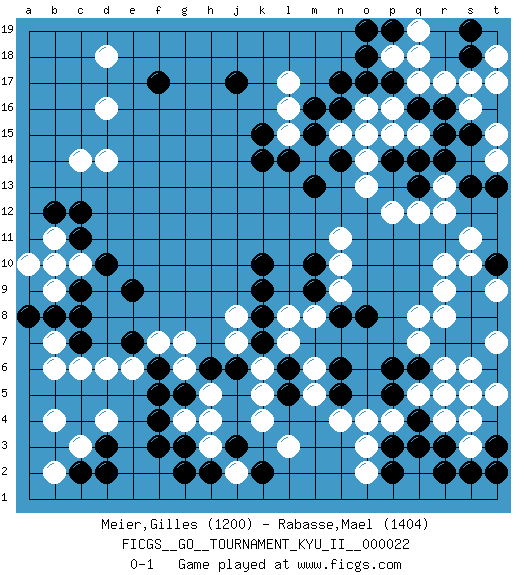 Last move : 0-1 2010 June 9 12:23:29 [Event "FICGS__GO__TOURNAMENT_KYU_II__000022"] [Site "FICGS"] [Date "2010.05.21"] [Round "1"] [Black "Meier,Gilles"] [White "Rabasse,Mael"] [Result "0-1"] [Rating 1 "1200"] [Rating 2 "1404"] 1.r16 d16 2.q4 d4 3.p17 r10 4.r7 r13 5.f3 h3 6.f5 d6 7.d2 c3 8.c2 o3 9.p3 o4 10.p2 l3 11.f17 d14 12.j17 c10 13.k10 d18 14.c12 c14 15.c8 b7 16.c7 c6 17.b8 b6 18.b10 b11 19.c11 b9 20.d10 a10 21.c9 b10 22.e9 b2 23.b12 l17 24.k15 q17 25.q16 p18 26.o17 r17 27.o18 s16 28.s15 s17 29.r14 q18 30.a8 s4 31.r5 s5 32.s2 s6 33.s7 r6 34.q6 r4 35.r3 q5 36.p5 p4 37.r5 s3 38.r2 q5 39.q3 q7 40.p6 q8 41.s9 r9 42.s8 s10 43.t10 s11 44.t6 t5 45.t3 t7 46.t8 r8 47.t6 o2 48.t2 t7 49.p19 t9 50.t16 f7 51.h6 g4 52.f4 g6 53.f6 g7 54.e7 e6 55.g5 h5 56.g3 h4 57.d3 b4 58.g2 j7 59.j6 k6 60.h2 j2 61.q13 l15 62.l14 m14 63.m15 l16 64.k14 n15 65.m16 q19 66.o19 o16 67.n17 p16 68.n14 p15 69.p14 q15 70.r15 o14 71.n16 o13 72.q14 o15 73.m13 p12 74.s13 r12 75.t17 t18 76.s19 t15 77.t16 t14 78.s18 q12 79.t13 t17 80.o8 m8 81.m9 n9 82.n8 n10 83.m10 n11 84.l6 k5 85.n6 l8 86.k7 j8 87.k8 l7 88.k9 m6 89.l5 m5 90.j3 k4 91.k2 r5 92.n5 n4 0-1 Here are the names of the openings (joseki) played in the four corners : Corner d4 : d4 f3 Hoshi (Hwajeom, Seongjeom, Xingwei`) 4-4 Point. The star or hoshi (4-4) point, emphasizing influence at the potential expense of territory. Ikken Kakari (Hankan Keolch'im, Yi Gua`jiao~, 1-Space Low Approach). Black 2 is the standard approach move to the 4-4. Corner d16 : d16 f17 Hoshi (Hwajeom, Seongjeom, Xingwei`) 4-4 Point. The star or hoshi (4-4) point, emphasizing influence at the potential expense of territory. Ikken Kakari (Hankan Keolch'im, Yi Gua`jiao~, 1-Space Low Approach). Black 2 is the standard approach move to the 4-4. Player White won this Go (weiqi, baduk) game. Follow this game move after move (download)Eyes win semiais. (Anonymous) Fortune favours the audacious. (Desiderius Erasmus)