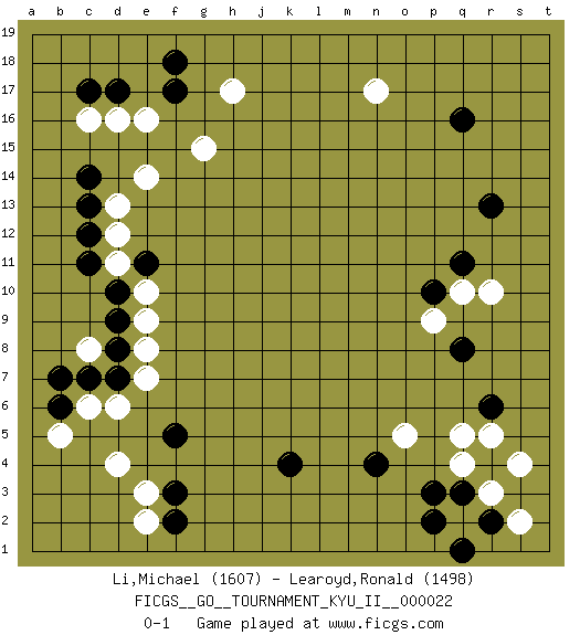Last move : 0-1 2010 August 25 22:47:30 [Event "FICGS__GO__TOURNAMENT_KYU_II__000022 "] [Site "FICGS"] [Date "2010.05.21"] [Round "1"] [Black "Li,Michael "] [White "Learoyd,Ronald "] [Result "0-1"] [Rating 1 "1607"] [Rating 2 "1498"] 1.q16 d4 2.q3 d16 3.f3 d6 4.k4 q5 5.q8 r3 6.r2 q2 7.p2 q4 8.p3 s2 9.q1 s4 10.r6 r5 11.f17 h17 12.c17 c16 13.d17 e16 14.f18 g15 15.c11 n17 16.r13 c8 17.c14 e14 18.e11 d12 19.c12 d11 20.d10 d13 21.c13 e10 22.d9 e9 23.d8 e8 24.d7 e7 25.c7 o5 26.n4 e2 27.f2 e3 28.f5 c6 29.b6 b5 30.b7 r10 31.q11 q10 32.p10 p9 0-1 This go game has been lost on time (started : 2010.05.21 23:42:30) Here are the names of the openings (joseki) played in the four corners : Corner d4 : d4 f3Hoshi (Hwajeom, Seongjeom, Xingwei`) 4-4 Point. The star or hoshi (4-4) point, emphasizing influence at the potential expense of territory.Ikken Kakari (Hankan Keolch'im, Yi Gua`jiao~, 1-Space Low Approach). Black 2 is the standard approach move to the 4-4. Corner q4 : q3 q5Komoku (Somok, Xiao~mu`) 3-4 Point. The komoku (3-4) point is the traditional corner enclosure move..Ikken Takagakari (Hankan Nop'dakeolch'im, Yi Gaogua`jiao~, 1-Space High Approach). The 5-4 approach move has become more popular in modern times, as modern Go emphasizes speed and influence. Corner d16 : d16 f17Hoshi (Hwajeom, Seongjeom, Xingwei`) 4-4 Point. The star or hoshi (4-4) point, emphasizing influence at the potential expense of territory.Ikken Kakari (Hankan Keolch'im, Yi Gua`jiao~, 1-Space Low Approach). Black 2 is the standard approach move to the 4-4. Corner q16 : q16 n17Hoshi (Hwajeom, Seongjeom, Xingwei`) 4-4 Point. The star or hoshi (4-4) point, emphasizing influence at the potential expense of territory.Niken Kakari (Dukan Keolch'im, E`r Gua`jiao~, 2-Space Low Approach). Black typically answers by 7-3 or 3-5 (which is not joseki). Player White won this Go (weiqi, baduk) game.Follow this game move after move (download ) In an unreasonable situation, an unreasonable move is reasonable. (Tamino) Knowledge will give you power, but character respect. (Bruce Lee)