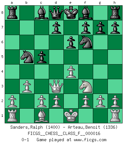 Last move : 0-1 2006 December 19 0:56:21 [Event "FICGS__CHESS__CLASS_F__000016"] [Site "FICGS"] [Date "2006.11.03"] [Round "1"] [White "Sanders,Ralph"] [Black "Arteau,Benoit"] [Result "0-1"] [WhiteElo "1400"] [BlackElo "1336"] 1.e4 c5 2.b3 Nf6 3.Nc3 Nc6 4.Bc4 a6 5.Qf3 Nd4 6.Qd3 e6 7.Nf3 b5 8.Bxb5 axb5 9.Nxb5 Nxb5 0-1 This chess game has been lost on time (started : 2006.11.03 0:13:50) Sicilian defense Player Black won this chess game. Follow this game move after move (download)All I want to do, ever, is just play Chess. (Bobby Fischer) Nach Morphy wurde nichts neues mehr in der Behandlung offener Positionen gefunden. (Mikhail Moiseyevich Botvinik) No hay precio que sea tan grande por la cabellera del Rey enemigo. (Koblentz) La menace est plus forte que l'exécution. (Aaron Nimzovitch) Don't anthropomorphize computers - they hate it. (Anonymous)