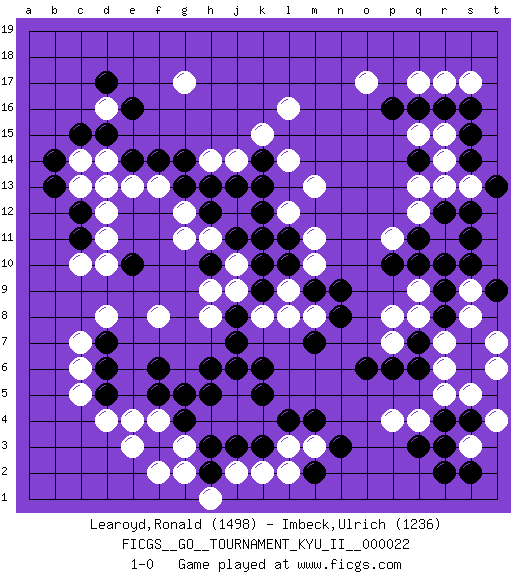Last move : 1-0 2010 November 20 4:57:30 [Event "FICGS__GO__TOURNAMENT_KYU_II__000022"] [Site "FICGS"] [Date "2010.05.21"] [Round "1"] [Black "Learoyd,Ronald"] [White "Imbeck,Ulrich"] [Result "1-0"] [Rating 1 "1498"] [Rating 2 "1236"] 1.q16 d4 2.q3 d16 3.r9 c10 4.f3 f4 5.g4 e3 6.f5 e4 7.g5 o17 8.q14 l16 9.e10 d8 10.c11 d11 11.c12 d12 12.d13 c13 13.b13 c14 14.b14 d10 15.c15 d14 16.d15 e13 17.e14 d13 18.e16 g17 19.d17 k4 20.m4 k2 21.k6 j5 22.h6 g3 23.h3 f2 24.h2 h4 25.j3 j4 26.k3 l3 27.l4 m3 28.k5 j2 29.j6 h1 30.h5 g2 31.n3 f8 32.m2 l2 33.h10 h8 34.k10 k8 35.m9 l9 36.l10 m8 37.n8 m10 38.n9 m11 39.m7 l8 40.k12 m13 41.k14 l14 42.f14 h14 43.j8 j9 44.j7 j10 45.j11 h9 46.k9 k11 47.l11 l12 48.k11 h11 49.h12 g11 50.j13 k15 51.g13 g12 52.h13 j14 53.k13 f13 54.g14 r17 55.r16 q17 56.d6 c6 57.d7 c7 58.d5 c5 59.f6 q12 60.r12 r11 61.q11 p11 62.q10 r13 63.s12 q13 64.s14 s13 65.t13 r14 66.s15 r15 67.s11 q15 68.p16 s17 69.s16 r5 70.r4 r7 71.s6 s5 72.s7 s3 73.s4 t4 74.r2 r6 75.s2 s8 76.r8 s9 77.s10 t6 78.t9 t7 79.p6 q4 80.r3 q8 81.q7 q9 82.r10 p7 83.q6 p8 84.p10 p4 85.o6 1-0 Here are the names of the openings (joseki) played in the four corners : Corner d4 : d4 f3 Hoshi (Hwajeom, Seongjeom, Xingwei`) 4-4 Point. The star or hoshi (4-4) point, emphasizing influence at the potential expense of territory. Ikken Kakari (Hankan Keolch'im, Yi Gua`jiao~, 1-Space Low Approach). Black 2 is the standard approach move to the 4-4. Corner q16 : q16 o17 Hoshi (Hwajeom, Seongjeom, Xingwei`) 4-4 Point. The star or hoshi (4-4) point, emphasizing influence at the potential expense of territory. Ikken Kakari (Hankan Keolch'im, Yi Gua`jiao~, 1-Space Low Approach). White 2 is the standard approach move to the 4-4. Corner d16 : d16 c11 Hoshi (Hwajeom, Seongjeom, Xingwei`) 4-4 Point. The star or hoshi (4-4) point, emphasizing influence at the potential expense of territory. Player Black won this Go (weiqi, baduk) game. Follow this game move after move (download)You can hide nothing on the goban. (Pierre Audouard) To err is human, to shift the blame on someone else is tactical. (Mladen Jankovic)