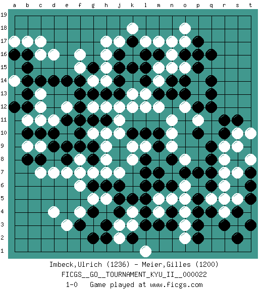 Last move : 1-0 2010 November 22 19:41:15 [Event "FICGS__GO__TOURNAMENT_KYU_II__000022"] [Site "FICGS"] [Date "2010.05.21"] [Round "1"] [Black "Imbeck,Ulrich"] [White "Meier,Gilles"] [Result "1-0"] [Rating 1 "1236"] [Rating 2 "1200"] 1.q16 d4 2.q4 d16 3.f3 d7 4.j4 o17 5.o16 n16 6.p17 o15 7.p16 o18 8.c14 c11 9.b16 c17 10.e14 f16 11.r10 o3 12.p3 o2 13.p2 k3 14.m3 m4 15.n4 o4 16.l4 m5 17.l3 k4 18.k5 j3 19.l5 n5 20.n3 o6 21.j5 r6 22.p5 o5 23.q6 r7 24.q7 r8 25.q8 s3 26.s4 r5 27.r3 r4 28.s2 s5 29.t3 r9 30.q9 s10 31.r11 e12 32.s11 s9 33.l7 o8 34.o7 n7 35.p7 m8 36.m6 m7 37.l8 l9 38.m9 n9 39.m10 n10 40.l10 g3 41.g4 f4 42.h3 l1 43.k2 j2 44.h2 n11 45.n14 n15 46.o13 k9 47.k10 m14 48.m13 m12 49.j9 k8 50.j8 l13 51.n13 l12 52.l6 g14 53.n6 q5 54.p4 p13 55.p12 o12 56.q13 p14 57.q14 p11 58.q12 e3 59.b12 b11 60.n8 b17 61.b14 c16 62.a16 a17 63.b15 c12 64.f13 g12 65.f12 f11 66.e11 e10 67.g11 d11 68.g13 h12 69.h13 j12 70.g15 f15 71.f14 h14 72.j14 h15 73.j15 h16 74.j13 k12 75.j16 h17 76.a12 c13 77.b13 a14 78.d14 j17 79.l14 m15 80.l15 k16 81.k15 k13 82.m16 m17 83.p15 h10 84.l16 l17 85.o14 n17 86.f10 f9 87.e11 g10 88.h11 j11 89.f11 j10 90.e9 f8 91.d10 c9 92.e8 e7 93.g9 h9 94.g8 h8 95.f7 j7 96.p10 g5 97.h6 g7 98.g6 h7 99.g2 f8 100.f9 f6 101.d9 f8 102.k17 k18 103.f7 h5 104.j6 f8 105.c10 b9 106.f7 m8 107.m7 f8 108.t7 f7 109.b10 s7 110.t5 t8 111.t6 t10 112.c8 c7 113.b8 1-0 Here are the names of the openings (joseki) played in the four corners : Corner d4 : d4 f3 Hoshi (Hwajeom, Seongjeom, Xingwei`) 4-4 Point. The star or hoshi (4-4) point, emphasizing influence at the potential expense of territory. Ikken Kakari (Hankan Keolch'im, Yi Gua`jiao~, 1-Space Low Approach). Black 2 is the standard approach move to the 4-4. Corner q16 : q16 o17 Hoshi (Hwajeom, Seongjeom, Xingwei`) 4-4 Point. The star or hoshi (4-4) point, emphasizing influence at the potential expense of territory. Ikken Kakari (Hankan Keolch'im, Yi Gua`jiao~, 1-Space Low Approach). White 2 is the standard approach move to the 4-4. Corner d16 : d16 c14 Hoshi (Hwajeom, Seongjeom, Xingwei`) 4-4 Point. The star or hoshi (4-4) point, emphasizing influence at the potential expense of territory. Ikken Kakari (Hankan Keolch'im, Yi Gua`jiao~, 1-Space Low Approach). Black 2 is the standard approach move to the 4-4. Corner q4 : q4 o3 Hoshi (Hwajeom, Seongjeom, Xingwei`) 4-4 Point. The star or hoshi (4-4) point, emphasizing influence at the potential expense of territory. Ikken Kakari (Hankan Keolch'im, Yi Gua`jiao~, 1-Space Low Approach). White 2 is the standard approach move to the 4-4. Player Black won this Go (weiqi, baduk) game. Follow this game move after move (download)Don't get surrounded ! Ever ! (Anonymous) I couldn't make any sense out of what this particular thread is about. It sounds like R2 D2 computer speaking. A space fight ?!? Some 'command' problems in Moscow ? Some killers & narcotic addicts attacking some game & a god wannabe ?? (Dinesh De Silva, lost in a russian conflict in FICGS forum)