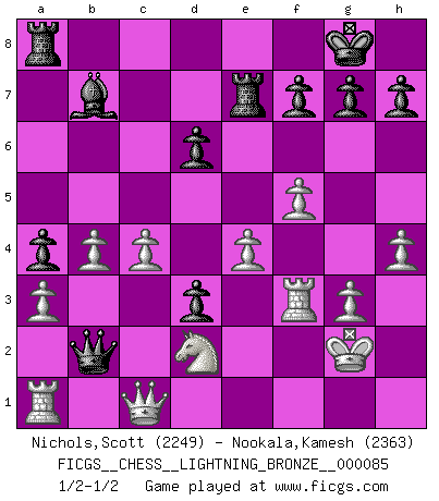 Last move : 1/2-1/2 2010 May 22 21:57:51 [Event "FICGS__CHESS__LIGHTNING_BRONZE__000085"] [Site "FICGS"] [Date "2010.05.22"] [Round "1"] [White "Nichols,Scott"] [Black "Nookala,Kamesh"] [Result "1/2-1/2"] [WhiteElo "2249"] [BlackElo "2363"] 1.e4 c5 2.Nf3 d6 3.d4 cxd4 4.Nxd4 Nf6 5.Nc3 a6 6.h4 e5 7.Nb3 Be7 8.Be2 Be6 9.f4 b5 10.f5 Bc8 11.a3 Bb7 12.Bf3 a5 13.Nxb5 a4 14.Nd2 O-O 15.c4 Nc6 16.Rb1 Nd4 17.Nxd4 exd4 18.b4 Nd7 19.g3 Ne5 20.O-O Qb6 21.Bb2 Bf6 22.Kg2 Rfe8 23.Ba1 Qa7 24.Be2 d3 25.Bf3 Re7 26.Qe1 Nxf3 27.Rxf3 Bxa1 28.Rxa1 Qd4 29.Qf1 Qb2 30.Qc1 1/2-1/2 Sicilian : Najdorf Kingside Castling by player Black (move 14) Kingside Castling by player White (move 20) This chess game ended in a draw. Follow this game move after move (download)When asked, -How is that you pick better moves than your opponents?, I responded: I'm very glad you asked me that, because, as it happens, there is a very simple answer. I think up my own moves, and I make my opponent think up his. (Alexander Alekhine) Irgendwie scheint mir sonntags früh um 9 Uhr der Killerinstinkt verloren gegangen zu sein. (Alexej Shirov) La captura del Rey enemigo es la finalidad pero no el primer objetivo de la partida. (William Steinitz) Vous n'êtes pas toujours obligé de jouer le meilleur coup. Un coup doit être actif, entreprenant, correct et beau ! (David Bronstein) Either move or be moved. (Ezra Pound)