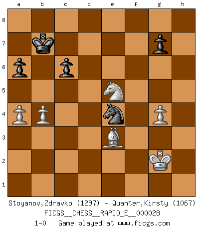 Last move : 1-0 2010 June 17 12:1:43 [Event "FICGS__CHESS__RAPID_E__000028"] [Site "FICGS"] [Date "2010.05.22"] [Round "1"] [White "Stoyanov,Zdravko"] [Black "Quanter,Kirsty"] [Result "1-0"] [WhiteElo "1297"] [BlackElo "1067"] 1.e4 e5 2.Nf3 Nc6 3.Bb5 Nge7 4.h3 a6 5.Bxc6 Nxc6 6.O-O d6 7.d3 f5 8.exf5 Bxf5 9.Re1 h6 10.d4 e4 11.Nh2 d5 12.a3 Qf6 13.c3 Bd6 14.f3 O-O-O 15.fxe4 Bxe4 16.Rf1 Qg6 17.Qg4+ Qxg4 18.Nxg4 Rhf8 19.Nd2 Bd3 20.Rxf8 Rxf8 21.Nf3 Bg3 22.Ne3 Ne7 23.Bd2 c6 24.b4 Bf4 25.Ne5 Bxe5 26.dxe5 b6 27.a4 Ng6 28.Ng4 h5 29.Nf2 Nxe5 30.Re1 Rf5 31.g4 Nf3+ 32.Kh1 hxg4 33.hxg4 Re5 34.Nxd3 Rxe1+ 35.Bxe1 d4 36.cxd4 Nxd4 37.Bf2 Ne6 38.Bxb6 Ng5 39.Ne5 Kb7 40.Be3 Ne4 41.Kg2 1-0 Ruy Lopez : Cozio defense Kingside Castling by player White (move 6) Queenside Castling by player Black (move 14) Player White won this chess game. Follow this game move after move (download)After a bad opening, there is hope for the middle game. After a bad middle game, there is hope for the endgame. But once you are in the endgame, the moment of truth has arrived. (Edmar Mednis) Schach wird sich dank seiner hohen kulturellen Tradition immer durchsetzen. In näherer Zukunft womöglich sogar als Gegenreaktion auf die maßlose Reizüberflutung im Freizeit- und Spielbereich. (Garry Kasparov) a manera como él juega al Ajedrez, demuestra la completa naturaleza de un hombre. (Stanley Ellin) On peut tirer plus d'utilité d'une partie perdue que de 100 parties gagnées. (Capablanca) Man is still the most extraordinary computer of all. (John F. Kennedy)