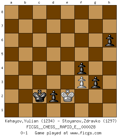 Last move : 0-1 2010 May 28 14:24:5 [Event "FICGS__CHESS__RAPID_E__000028"] [Site "FICGS"] [Date "2010.05.22"] [Round "1"] [White "Kehayov,Yulian"] [Black "Stoyanov,Zdravko"] [Result "0-1"] [WhiteElo "1234"] [BlackElo "1297"] 1.d4 c6 2.e4 d6 3.Be3 a6 4.c4 Nd7 5.Nc3 e5 6.d5 Ndf6 7.Nf3 Bg4 8.Be2 Qa5 9.Bd2 Be7 10.dxc6 bxc6 11.a3 c5 12.Nd5 Qd8 13.Nxf6+ Nxf6 14.h3 Bh5 15.Nh2 Bg6 16.Bd3 Bxe4 17.Bxe4 Nxe4 18.Qe2 Nxd2 19.Qxd2 Bg5 20.Qe2 O-O 21.O-O Qf6 22.Nf3 Rfe8 23.Nxg5 Qxg5 24.Qe4 Rab8 25.Rab1 Re6 26.Qc6 Rg6 27.b4 h6 28.bxc5 Rd8 29.cxd6 Kh7 30.Qe4 R8xd6 31.Rb3 Rd4 32.Qf3 e4 33.Qg3 Rxc4 34.Qxg5 Rxg5 35.Rb4 Rxb4 36.axb4 Rb5 37.Ra1 Rb6 38.Kh2 Kg6 39.Kg3 Kf5 40.Ra3 Re6 41.Kh2 Ke5 42.Kg3 f5 43.f3 f4+ 44.Kf2 e3+ 45.Ke2 Rd6 46.Rd3 Rd5 47.Ra3 Rd2+ 48.Kf1 Rb2 49.Rxa6 Rxb4 50.Ra2 Kd4 51.Ke1 Kc3 52.Kd1 Rd4+ 53.Ke1 Rd2 54.Rxd2 exd2+ 55.Kd1 g5 56.h4 gxh4 57.g3 hxg3 58.Ke2 Kc2 0-1 Queen's pawn Kingside Castling by player Black (move 20) Kingside Castling by player White (move 21) 10 pieces endgame at move 54 : White KRPPP , Black KPPPP WHITE : King + 1 Rook 3 Pawns BLACK : King + 4 Pawns 9 pieces endgame at move 54 : White KPPP , Black KPPPP WHITE : King + 3 Pawns BLACK : King + 4 Pawns 8 pieces endgame at move 56 : White KPP , Black KPPPP WHITE : King + 2 Pawns BLACK : King + 4 Pawns 7 pieces endgame at move 57 : White KP , Black KPPPP WHITE : King + 1 Pawn BLACK : King + 4 Pawns Player Black won this chess game. Follow this game move after move (download)Different people feel differently about resigning. (Bobby Fischer) Als er Schachweltmeister wurde ließ er praktisch alle stärksten Sovietspieler für sich arbeiten. Wenn ein auch nur mittelmässiger Meister ein Spezialist für eine bestimmte Eröffnung war, wurde er von Karpov gerufen. Das wurde alles geheim gehalten. (Mikhail Moiseyevich Botvinik) Aún el Rey más flojo huye despavorido ante la amenaza de un Jaque doble. (Aaron Nimzowitsch) Il s'avisa de me proposer d'apprendre les échecs qu'il jouait un peu... me voilà forcené des échecs. J'achète un échiquier, je m'enferme dans ma chambre, j'y passe des jours et des nuits à vouloir apprendre par cur toutes les parties. (Jean-Jacques Rousseau, Confessions) Indecision is the key to flexibility. (Unknown)