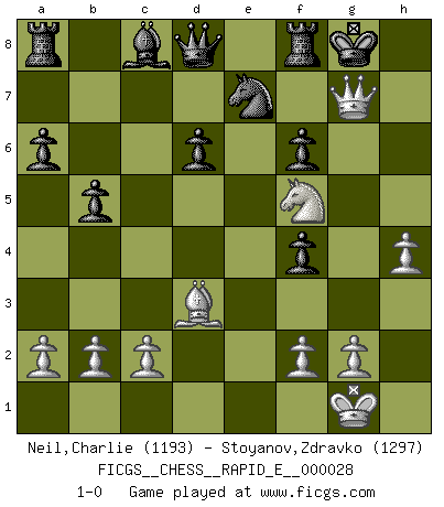 Last move : 1-0 2010 June 22 21:40:48 [Event "FICGS__CHESS__RAPID_E__000028"] [Site "FICGS"] [Date "2010.05.22"] [Round "1"] [White "Neil,Charlie"] [Black "Stoyanov,Zdravko"] [Result "1-0"] [WhiteElo "1193"] [BlackElo "1297"] 1.Nf3 c5 2.e4 a6 3.d4 e6 4.dxc5 Bxc5 5.Nc3 b5 6.Bd3 Nc6 7.O-O Nge7 8.Bf4 h6 9.Ne5 Nxe5 10.Bxe5 O-O 11.Qg4 f6 12.Bf4 Kh7 13.h4 e5 14.Rae1 exf4 15.e5 Kh8 16.exf6 gxf6 17.Qh5 Ng8 18.Ne4 Bb6 19.Nd6 Ba5 20.Nf5 Bxe1 21.Rxe1 d6 22.Re7 Nxe7 23.Qxh6+ Kg8 24.Qg7+ 1-0 Reti Opening Kingside Castling by player White (move 7) Kingside Castling by player Black (move 10) Player White won this chess game. Follow this game move after move (download)Half the variations which are calculated in a tournament game turn out to be completely superfluous. Unfortunately, no one knows in advance which half. (Jan Tinman) Wenn Du absolut nicht mehr weißt, was Du tun sollst, dann ist es Zeit für Panik. (John van der Wiel) El Ajedrez no es como la vida... ¡tiene reglas!. (Mark Pasternak) Le pion, dans sa simplicité, marche droit devant lui, mais lorsqu'il prend, il le fait obliquement? Ainsi l'homme, tant qu'il reste pauvre, marche dans la droiture et vit honnêtement, mais lorsqu'il recherche les honneurs, il flatte, se parjure et, par les voies obliques, cherche une position supérieure sur l'échiquier du monde. (Jean de Galles) When I took office, only high energy physicists had ever heard of what is called the World Wide Web... Now even my cat has its own page. (Bill Clinton, 1996)
