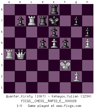 Last move : 1-0 2010 July 8 19:52:31 [Event "FICGS__CHESS__RAPID_E__000028"] [Site "FICGS"] [Date "2010.05.22"] [Round "1"] [White "Quanter,Kirsty"] [Black "Kehayov,Yulian"] [Result "1-0"] [WhiteElo "1067"] [BlackElo "1234"] 1.e4 d5 2.e5 e6 3.f4 f5 4.Bb5+ Bd7 5.Bxd7+ Qxd7 6.c3 Ne7 7.Nf3 Ng6 8.d4 Be7 9.h4 Nc6 10.a3 O-O-O 11.Nbd2 Nxf4 12.h5 Nd3+ 13.Kf1 Nxc1 14.Rxc1 h6 15.Nb3 a6 16.Qd3 Na7 17.Nbd2 Bg5 18.b4 Bxd2 19.Qxd2 Qb5+ 20.Kf2 Qc4 21.a4 a5 22.Nh4 axb4 23.cxb4 Qb3 24.a5 Qa4 25.Ng6 Rhe8 26.Ra1 Qb5 27.Rhc1 Qd7 28.Kf3 Nc6 29.b5 Ne7 30.a6 Nxg6 31.a7 Nxe5+ 32.dxe5 Qxb5 33.a8Q+ Kd7 34.Qa4 Qxa4 35.Rxa4 Ke7 36.Rxc7+ Rd7 37.Qb4+ 1-0 Scandinavian (centre counter) defense Queenside Castling by player Black (move 10) Promotion Queen by player White (move 33) Player White won this chess game. Follow this game move after move (download)Modern Chess is too much concerned with things like Pawn structure. Forget it, Checkmate ends the game. (Nigel Short) Wenn Schach ein enormer Dschungel ist, der seine Myriaden von Geheimnissen nicht preisgeben will, dann sind Computer die Kettensägen einer gewaltigen ökologisch unsensiblen Nutzholzfirma. (Nigel Short) Yo nunca en mi vida he jugado la Defensa Francesa, que viene siendo la más aburrida de todas las Aperturas. (Wilhelm Steinitz) Les Echecs représentent une sphère d'idées créatrices basée sur la volonté des deux protagonistes. (Smyslov) Hold em is to stud what chess is to checkers. (Johnny Moss)
