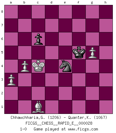 Last move : 1-0 2010 July 1 21:34:31 [Event "FICGS__CHESS__RAPID_E__000028"] [Site "FICGS"] [Date "2010.05.22"] [Round "1"] [White "Chhawchharia,Gaurav"] [Black "Quanter,Kirsty"] [Result "1-0"] [WhiteElo "1206"] [BlackElo "1067"] 1.e4 e5 2.d3 f6 3.Nc3 Bb4 4.Bd2 c6 5.Nf3 g5 6.h3 d6 7.a3 Bxc3 8.Bxc3 g4 9.hxg4 Bxg4 10.Be2 h5 11.Nd2 Bxe2 12.Qxe2 h4 13.O-O-O Nd7 14.Nf3 Qe7 15.Nxh4 O-O-O 16.Ng6 Qh7 17.Rxh7 Rxh7 18.d4 Rh2 19.g3 Re8 20.dxe5 fxe5 21.Rxd6 Kc7 22.Qd2 Rh1+ 23.Qd1 Rxd1+ 24.Rxd1 Ne7 25.Nxe5 Nxe5 26.Bxe5+ Kc8 27.b4 Ng6 28.Bd4 Rxe4 29.Bxa7 b5 30.Rd4 Rxd4 31.Bxd4 Kd7 32.Kb2 Kd6 33.Bc5+ Kd5 34.Kb3 Ne5 35.f4 Nf3 36.f5 Nd2+ 37.Kb2 Nc4+ 38.Kb3 Nd2+ 39.Ka2 Ne4 40.g4 Ke5 41.Be3 Nf6 42.g5 Ng4 43.Bd2 Kxf5 44.Kb3 Nf2 45.c4 Ne4 46.Bc1 bxc4+ 47.Kxc4 1-0 Variation Indian Opening : Indian Opening Queenside Castling by player White (move 13) Queenside Castling by player Black (move 15) 10 pieces endgame at move 43 : White KBPPPP , Black KNPP WHITE : King + 1 Bishop 4 Pawns BLACK : King + 1 Knight 2 Pawns 9 pieces endgame at move 46 : White KBPPP , Black KNPP WHITE : King + 1 Bishop 3 Pawns BLACK : King + 1 Knight 2 Pawns 8 pieces endgame at move 47 : White KBPPP , Black KNP WHITE : King + 1 Bishop 3 Pawns BLACK : King + 1 Knight 1 Pawn Player White won this chess game. Follow this game move after move (download)You have to have the fighting spirit. You have to force moves and take chances. (Bobby Fischer) Kleine Schachspieler machen Mist, und große Schachspieler machen Mist, aber große machen weniger Mist. (Fritz Sämisch) Nada excita más a Grandes Maestros aburridos que una novedad teórica. (Dominic Lawson) Même si l'adversaire joue le coup analysé précédemment, recommencez l'analyse en voyant la nouvelle position. Première règle de Blumenfeld The hypothalamus is one of the most important parts of the brain, involved in many kinds of motivation, among other functions. The hypothalamus controls the 'Four Fs: Fighting, Fleeing, Feeding and Mating. (Unknown author)