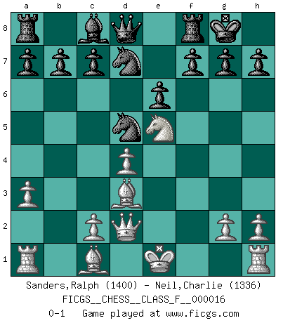 Last move : 0-1 2007 January 15 12:22:16 [Event "FICGS__CHESS__CLASS_F__000016"] [Site "FICGS"] [Date "2006.11.03"] [Round "1"] [White "Sanders,Ralph"] [Black "Neil,Charlie"] [Result "0-1"] [WhiteElo "1400"] [BlackElo "1336"] 1.e4 e6 2.d4 d5 3.Nc3 Nf6 4.f3 dxe4 5.fxe4 Bb4 6.a3 Bxc3+ 7.bxc3 O-O 8.Nf3 Nxe4 9.Bd3 Nxc3 10.Qd2 Nd5 11.Ne5 Nd7 0-1 French defense Kingside Castling by player Black (move 7) Player Black won this chess game. Follow this game move after move (download)Every Chess master was once a beginner. (Chernev) Je mehr wir mit Computern analysieren, desto mehr glauben wir an Verteidigung. (Vladimir Kramnik) Un entendimiento minucioso de las típicas continuaciones de mate hacen de las mas complicadas combinaciones de sacrificio que conducen hacia ellas no solo no dificiles, sino casi un asunto de rutina. (Siegbert Tarrasch) Plusieurs personnes se sont demandées comment Tal faisait pour gagner... En fait, c'est très simple ! Il met ses pièces au centre de l'échiquier et les sacrifie quelque part ! (David Bronstein) Cactus - It is depressed cucumber. (Ilmars Cirulis)