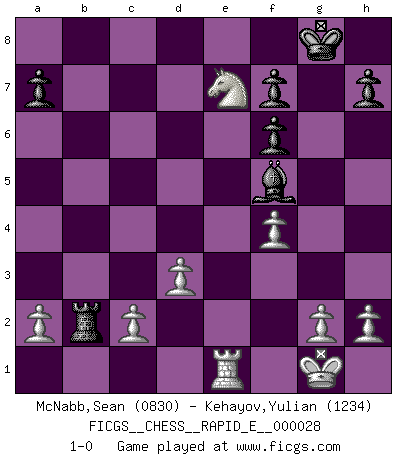 Last move : 1-0 2010 June 2 22:32:0 [Event "FICGS__CHESS__RAPID_E__000028"] [Site "FICGS"] [Date "2010.05.22"] [Round "1"] [White "McNabb,Sean"] [Black "Kehayov,Yulian"] [Result "1-0"] [WhiteElo "0830"] [BlackElo "1234"] 1.e4 e5 2.Nf3 d6 3.Bb5+ c6 4.Bc4 Nf6 5.Nc3 d5 6.exd5 cxd5 7.Bb5+ Nc6 8.Bxc6+ bxc6 9.Nxe5 Bd6 10.Nxc6 Qd7 11.Qe2+ Qe6 12.Qxe6+ Bxe6 13.O-O O-O 14.d3 Bd7 15.Nd4 Be5 16.Be3 Bxd4 17.Bxd4 Rfe8 18.f4 Bf5 19.Rfe1 Rxe1+ 20.Rxe1 Rb8 21.Bxf6 gxf6 22.Nxd5 Rxb2 23.Ne7+ 1-0 Philidor's defense Kingside Castling by player White (move 13) Kingside Castling by player Black (move 13) Player White won this chess game. Follow this game move after move (download)If I win a tournament, I win it by myself. I do the playing. Nobody helps me. (Bobby Fischer) Ein guter Spieler hat immer Glück. (José Raúl Capablanca) El juego de Damas es para vagabundos. (Paul Morphy) En blitz, le Cavalier l'emporte sur le Fou. (Vlastimil Hort) 98% of all statistics are made up. (Author unknown)