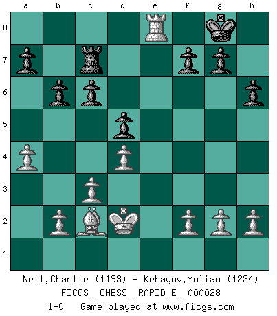 Last move : 1-0 2010 July 11 20:1:22 [Event "FICGS__CHESS__RAPID_E__000028"] [Site "FICGS"] [Date "2010.05.22"] [Round "1"] [White "Neil,Charlie"] [Black "Kehayov,Yulian"] [Result "1-0"] [WhiteElo "1193"] [BlackElo "1234"] 1.e4 e5 2.Nf3 Nc6 3.Bb5 Nb8 4.Nxe5 Nf6 5.Qf3 Bd6 6.d4 O-O 7.Nd3 c6 8.Ba4 Bc7 9.c3 Qe7 10.Bc2 d6 11.Be3 Qxe4 12.Qxe4 Nxe4 13.Nd2 Nxd2 14.Kxd2 Nd7 15.Rae1 Nf6 16.Bf4 Bd7 17.Nc5 b6 18.Nxd7 Nxd7 19.Re7 Rfe8 20.Rxd7 Rac8 21.Re1 Red8 22.Rde7 d5 23.Bxc7 Rf8 24.Bd6 h6 25.Rc7 Rxc7 26.Bxc7 Rc8 27.a4 Rxc7 28.Re8+ 1-0 Ruy Lopez (Spanish Opening) Kingside Castling by player Black (move 6) Player White won this chess game. Follow this game move after move (download)Fischer was a master of clarity and a king of artful positioning. His opponents would see where he was going but were powerless to stop him. (Bruce Pandolfini) Frage des Reporters: -Worin besteht das Ziel von Gambiteröffnungen? Antwort: -Auf Kosten der Partie einen Ruf als Angriffspieler zu erwerben.- (Siegbert Tarrasch) Cada Peón es una Reina en potencia. (James Mason) Le succès, c'est être capable d'aller d'échec en échec sans perdre son enthousiasme. (Winston Churchill) Good decisions come from experience, and experience comes from bad decisions. (Anonymous)