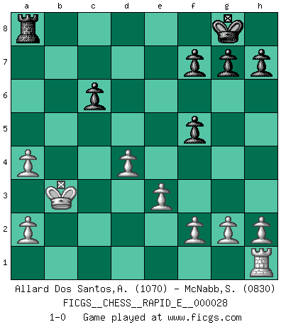 Last move : 1-0 2010 July 29 9:51:20 [Event "FICGS__CHESS__RAPID_E__000028"] [Site "FICGS"] [Date "2010.05.22"] [Round "1"] [White "Allard Dos Santos,Alexandre"] [Black "McNabb,Sean"] [Result "1-0"] [WhiteElo "1070"] [BlackElo "0830"] 1.d4 d5 2.c4 c6 3.Nc3 Nf6 4.Nf3 Bf5 5.Qb3 Qc7 6.cxd5 cxd5 7.Nxd5 Nxd5 8.Qxd5 e6 9.Qb5+ Qc6 10.Qxc6+ Nxc6 11.Bd2 Bb4 12.e3 O-O 13.Bb5 Bxd2+ 14.Kxd2 a6 15.Bxc6 bxc6 16.Rac1 Rab8 17.b3 a5 18.Nh4 a4 19.Nxf5 exf5 20.bxa4 Rb2+ 21.Rc2 Rxc2+ 22.Kxc2 Ra8 23.Kb3 1-0 This chess game has been lost on time (started : 2010.05.22 21:29:13) QGD Slav defense Kingside Castling by player Black (move 12) Player White won this chess game. Follow this game move after move (download)We like to think. (Gary Kasparov) Schach ist das schnellste Spiel der Welt, weil man in jeder Sekunde Tausende von Gedanken ordnen muß. (Albert Einstein) a manera como él juega al Ajedrez, demuestra la completa naturaleza de un hombre. (Stanley Ellin) C'est une question de caractère, Beaucoup de gens perdent leur motivation très vite. D'autres, ils sont rares, peuvent la conserver très longtemps. J'aime les échecs, encore aujourd'hui je suis heureux d'analyser des parties. J'aime toujours gagner, je déteste encore perdre. Bien jouer est important pour mon intégrité intellectuelle et morale. Et puis les échecs vivent en ce moment une période historique grâce à Internet. Ils se développent dans les systèmes éducatifs à travers le monde. Ils sortent de leur ghetto, et c'est mon rôle de mener à bien cette révolution. (Gary Kasparov) True nature is revealed in times of difficulty. (Chinese proverb)