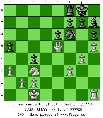 Last move : 1-0 2010 August 24 20:13:25 [Event "FICGS__CHESS__RAPID_E__000028"] [Site "FICGS"] [Date "2010.05.22"] [Round "1"] [White "Chhawchharia,Gaurav"] [Black "Neil,Charlie"] [Result "1-0"] [WhiteElo "1206"] [BlackElo "1193"] 1.e4 c6 2.Nc3 d5 3.exd5 cxd5 4.d4 Bf5 5.Be3 Nf6 6.h3 e6 7.a3 h6 8.Nf3 Nc6 9.Bb5 Bd6 10.Qd2 O-O 11.Bxc6 bxc6 12.Bf4 Rc8 13.Bxd6 Qxd6 14.Ne5 c5 15.O-O-O a6 16.Qf4 Qd8 17.h4 cxd4 18.Rxd4 Qa5 19.Qe3 Qc7 20.f3 a5 21.g4 Bh7 22.h5 Qc4 23.Nxc4 Rxc4 24.Rxc4 dxc4 25.Qe5 1-0 Caro-Kann defense Kingside Castling by player Black (move 10) Queenside Castling by player White (move 15) Player White won this chess game. Follow this game move after move (download)Chess is a fairy tale of 1001 blunders. (Savielly Tartakower) Wenn sie aufgeben, dann danke ich Ihnen für das Spiel (Eventualzug beim Fernschach). (Anonymous) La enorme capacidad mental, en la que sin ella no puede un jugador de Ajedrez existir, es demasiado requerida por el Ajedrez al grado de que nunca podrá liberar su mente de este juego. (Albert Einstein) On peut tirer plus d'utilité d'une partie perdue que de 100 parties gagnées. (Capablanca) There are two major products that came out of Berkeley: LSD and UNIX. We do not believe this is to be a coincidence. (Jeremy S. Anderson)