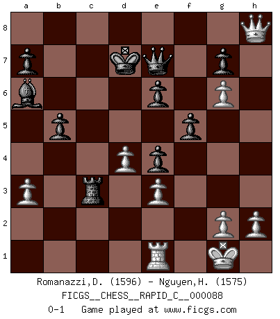 Last move : 0-1 2010 August 13 10:37:33 [Event "FICGS__CHESS__RAPID_C__000088"] [Site "FICGS"] [Date "2010.05.23"] [Round "1"] [White "Romanazzi,Dante"] [Black "Nguyen,Hao Nhien"] [Result "0-1"] [WhiteElo "1596"] [BlackElo "1575"] 1.d4 d5 2.e3 Nf6 3.Bd3 e6 4.Ne2 Bd6 5.O-O O-O 6.f4 c5 7.c3 Nc6 8.Bc2 Ne4 9.Bxe4 dxe4 10.Ng3 f5 11.a3 Qe7 12.Nd2 b6 13.Nc4 cxd4 14.Nxd6 Qxd6 15.cxd4 Ba6 16.Re1 Rac8 17.Bd2 Bd3 18.Rc1 Rf7 19.Bc3 Rfc7 20.Nh1 Ne7 21.Nf2 Ba6 22.Nh3 Nd5 23.Ng5 h6 24.Qa4 b5 25.Qd1 hxg5 26.fxg5 Nxc3 27.bxc3 Rxc3 28.Rxc3 Rxc3 29.Qh5 Kf8 30.g6 Ke7 31.Qh4+ Kd7 32.Qh8 Qe7 0-1 This chess game has been lost on time (started : 2010.05.23 13:45:27) Queen's pawn : Stonewall attack Kingside Castling by player White (move 5) Kingside Castling by player Black (move 5) Player Black won this chess game. Follow this game move after move (download)Capture of the adverse King is the ultimate but not the first object of the game. (William Steinitz) Die Fehler sind da, Sie warten nur darauf gemacht zu werden. (Savielly Grigorievitsch Tartakower) Hay dos clases de hombres: aquellos que se conforman en dejarse llevar por las circunstancias y que juegan barajas y aquellos decididos a controlar las circunstancias y que juegan al Ajedrez. (Mortimer Collins) Les Echecs sont affaire de jugement sensible. Savoir quand frapper et quand esquiver. (Fischer) If things go wrong, don't go with them. (Roger Babson)