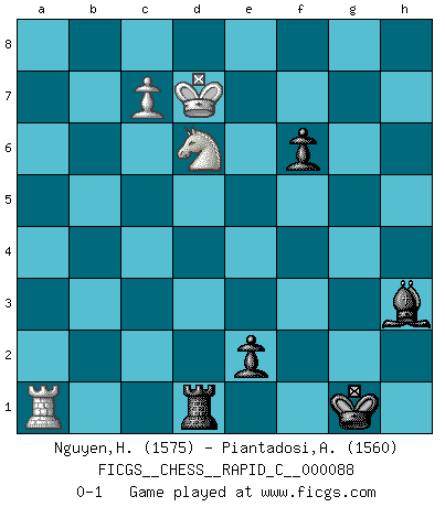 Last move : 0-1 2010 August 3 14:52:9 [Event "FICGS__CHESS__RAPID_C__000088"] [Site "FICGS"] [Date "2010.05.23"] [Round "1"] [White "Nguyen,Hao Nhien"] [Black "Piantadosi,Angelo"] [Result "0-1"] [WhiteElo "1575"] [BlackElo "1560"] 1.e4 c5 2.Nf3 d6 3.d4 cxd4 4.Nxd4 Nf6 5.Nc3 a6 6.Bc4 e6 7.Be3 Be7 8.Qd2 Nc6 9.f3 O-O 10.O-O-O Nxd4 11.Bxd4 Bd7 12.e5 Ne8 13.exd6 Nxd6 14.Bd3 Bf6 15.Bc5 Be7 16.Bxd6 Bxd6 17.Bxh7+ Kxh7 18.Qxd6 Bc6 19.Qe5 Qf6 20.Qxf6 gxf6 21.Rd4 Rg8 22.Rh4+ Kg7 23.Rg4+ Kf8 24.Rxg8+ Kxg8 25.Rd1 Kg7 26.Rd4 Rh8 27.h3 f5 28.a4 Kf6 29.b4 Rg8 30.Rd2 Kg5 31.b5 axb5 32.axb5 Be8 33.Kb2 f6 34.Kb3 Kf4 35.Kb4 Ke3 36.Re2+ Kf4 37.Kc5 Bf7 38.Kb6 Rc8 39.Na4 Be8 40.Nc5 e5 41.Nxb7 Rb8 42.Kc7 Bxb5 43.Rd2 Rg8 44.Nd6 Bf1 45.g4 fxg4 46.hxg4 Kxf3 47.c4 Rxg4 48.c5 e4 49.c6 e3 50.Ra2 e2 51.Ra3+ Kf2 52.Ra2 Kg1 53.Ra1 Rd4 54.Kd7 Rd1 55.c7 Bh3+ 0-1 Sicilian : Najdorf, Lipnitzky attack Kingside Castling by player Black (move 9) Queenside Castling by player White (move 10) 10 pieces endgame at move 46 : White KRNPP , Black KRBPP WHITE : King + 1 Rook 1 Knight 2 Pawns BLACK : King + 1 Rook 1 Bishop 2 Pawns 9 pieces endgame at move 47 : White KRNP , Black KRBPP WHITE : King + 1 Rook 1 Knight 1 Pawn BLACK : King + 1 Rook 1 Bishop 2 Pawns Player Black won this chess game. Follow this game move after move (download)Later, I began to succeed in decisive games. Perhaps because I realized a very simple truth: not only was I worried, but also my opponent. (Mikhail Tal) Irgendwie scheint mir sonntags früh um 9 Uhr der Killerinstinkt verloren gegangen zu sein. (Alexej Shirov) Los Peones son nacidos libres, y aún así, se encuentran por doquier encadenados. (Rick Kennedy) Botvinnik disait en comparant les échecs à la musique: Il existe une science dont le but est l'étude de l'acoustique et des sons. Mais il y a aussi un art qui se sert de l'océan des sons : c'est la musique. De toute évidence, il en est de même pour la pensée. La logique est l'étude des lois de la réflexion et les échecs reflètent, en tant qu'art, le côté logique de la réflexion, sous la forme d'images artistiques... Extrait de Fischer - Spassky, Reykjavik 1972 par Alexander & F. Wyndham (Ed. Solar), p 37. The beginning of wisdom is silence. The second step is listening. (Unknown)