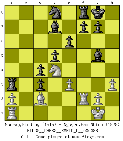 Last move : 0-1 2010 June 4 1:49:13 [Event "FICGS__CHESS__RAPID_C__000088"] [Site "FICGS"] [Date "2010.05.23"] [Round "1"] [White "Murray,Findlay"] [Black "Nguyen,Hao Nhien"] [Result "0-1"] [WhiteElo "1515"] [BlackElo "1575"] 1.e4 e6 2.d4 d5 3.Nd2 Nf6 4.e5 Nfd7 5.Bd3 c5 6.c3 Nc6 7.Ne2 Qb6 8.Nf3 a6 9.O-O Qc7 10.Re1 b5 11.Bf4 c4 12.Bc2 a5 13.Ng3 b4 14.Qe2 Qb6 15.Ng5 Nd8 16.Nxh7 a4 17.Ng5 a3 18.bxa3 bxc3 19.Rab1 Qxd4 20.Qe3 Qxe3 21.Bxe3 Rxa3 22.Ra1 Nxe5 23.Reb1 Bd6 24.Ne2 Ng4 25.h3 Nxe3 26.fxe3 O-O 27.Nd4 Bd7 28.Rf1 Be7 29.Rf2 Bxg5 0-1 French : Tarrasch, Closed variation Kingside Castling by player White (move 9) Kingside Castling by player Black (move 26) Player Black won this chess game. Follow this game move after move (download)By the beauty of his games, the clarity of his play, and the brilliance of his ideas, Fischer made himself an artist of the same stature as Brahms, Rembrandt, and Shakespeare. (David Levy) Ohne Leiden bildet sich kein Charakter. (Ernst Freiherr von Feuchtersleben) El Ajedrez hace al hombre ser mas sabio y ver mas claro. (Vladimir Putin) Il vaut mieux sacrifier les pièces de l'adversaire. (Xavier Tartacover) Children in the dark cause accidents, accidents in the dark cause children. (Unknown)