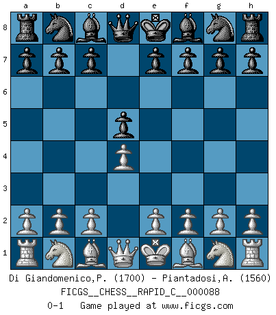 Last move : 0-1 2010 June 24 9:4:11 [Event "FICGS__CHESS__RAPID_C__000088"] [Site "FICGS"] [Date "2010.05.23"] [Round "1"] [White "Di Giandomenico,Pierino"] [Black "Piantadosi,Angelo"] [Result "0-1"] [WhiteElo "1700"] [BlackElo "1560"] 1.d4 d5 0-1 This chess game has been lost on time (started : 2010.05.23 13:45:27) Queen's pawn game Player Black won this chess game. Follow this game move after move (download)Chess is a part of culture and if a culture is declining then Chess too will decline. (Mikhail Botvinnik) Es gibt Leute, die glauben, alles wäre vernünftig, was man mit einem ernsthaften Gesicht tut. (Georg Christoph Lichtenberg) Cuando tengas duda... ¡juega al Ajedrez!. (Tevis) L'attaque fait le spectacle, la défense gagne les matchs. (Dicton footballistique) Any activity becomes creative when the doer cares about doing it right or doing it better. (John Updike)