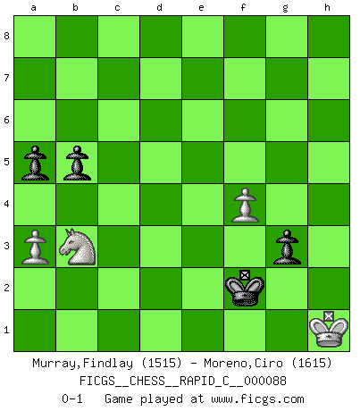 Last move : 0-1 2010 August 8 1:29:39 [Event "FICGS__CHESS__RAPID_C__000088"] [Site "FICGS"] [Date "2010.05.23"] [Round "1"] [White "Murray,Findlay"] [Black "Moreno,Ciro"] [Result "0-1"] [WhiteElo "1515"] [BlackElo "1615"] 1.e4 c5 2.c3 d5 3.exd5 Qxd5 4.d4 cxd4 5.cxd4 e5 6.Nf3 exd4 7.Qxd4 Qe6+ 8.Qe3 Bb4+ 9.Nc3 Ne7 10.Bb5+ Nbc6 11.Qxe6 Bxe6 12.O-O O-O 13.Bd2 Bg4 14.Ne4 Bxf3 15.gxf3 Bxd2 16.Nxd2 Nd4 17.Bc4 Rfd8 18.Rad1 Ng6 19.Rfe1 Rac8 20.Bb3 Nf4 21.Re7 Nxf3+ 22.Nxf3 Rxd1+ 23.Bxd1 Kf8 24.Re1 Nd3 25.Rf1 Nxb2 26.Bb3 f6 27.Kg2 g5 28.Re1 Nd3 29.Rd1 Nc5 30.Rc1 b6 31.Rc2 Rd8 32.Rd2 Rxd2 33.Nxd2 Ke7 34.Kf3 f5 35.Bc2 Kf6 36.Nb3 Ne6 37.Ke3 Ke5 38.Nd2 f4+ 39.Ke2 Nd4+ 40.Kd3 Nxc2 41.Kxc2 g4 42.Kd3 h5 43.Nc4+ Kd5 44.Na3 h4 45.Ke2 h3 46.Kf1 a5 47.Nc2 b5 48.f3 g3 49.hxg3 fxg3 50.a3 Ke5 51.Na1 Kf4 52.Nb3 Ke3 53.f4 h2 54.Kg2 h1Q+ 55.Kxh1 Kf2 0-1 Sicilian : Alapin's variation (2.c3) Kingside Castling by player White (move 12) Kingside Castling by player Black (move 12) 10 pieces endgame at move 49 : White KNPPP , Black KPPPP WHITE : King + 1 Knight 3 Pawns BLACK : King + 4 Pawns 9 pieces endgame at move 49 : White KNPP , Black KPPPP WHITE : King + 1 Knight 2 Pawns BLACK : King + 4 Pawns Promotion Queen by player Black (move 54) 8 pieces endgame at move 55 : White KNPP , Black KPPP WHITE : King + 1 Knight 2 Pawns BLACK : King + 3 Pawns Player Black won this chess game. Follow this game move after move (download)Many Chess players were surprised when after the game, Fischer quietly explained: 'I had already analyzed this possibility' in a position which I thought was not possible to foresee from the opening. (Mikhail Tal) Die unerbitterlichsten Regeln im Schach sind die Ausnahmen. (Savielly Grigorievitsch Tartakower) La maestría del Ajedrez consiste esencialmente en analizar posiciónes de Ajedrez con precisión. (Mikhail Botvinnik) Les pièces de l'échiquier étaient impitoyables. Elles le retenaient, elles l'absorbaient. Il y avait de l'horreur en cela, mais aussi une harmonie unique. Car, qu'y a-t-il dans le monde, à part les échecs ? (V. Nabokov) The ultimate in disposing one's troops is to be without ascertainable shape. Then the most penetrating spies cannot pry in nor can the wise lay plans against you. (Sun Tzu)