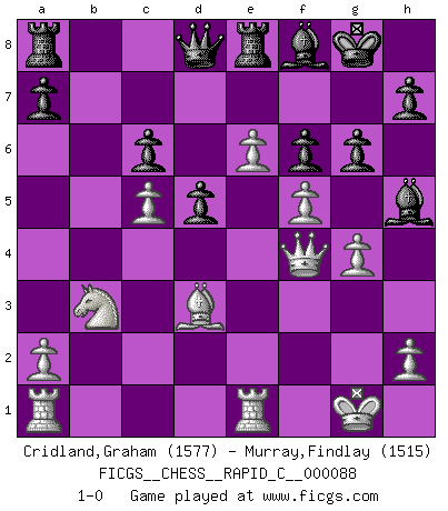 Last move : 1-0 2010 June 2 22:5:14 [Event "FICGS__CHESS__RAPID_C__000088"] [Site "FICGS"] [Date "2010.05.23"] [Round "1"] [White "Cridland,Graham"] [Black "Murray,Findlay"] [Result "1-0"] [WhiteElo "1577"] [BlackElo "1515"] 1.e4 e5 2.Nf3 Nf6 3.d4 Nxe4 4.Bd3 d5 5.Nxe5 Nd7 6.Nxd7 Bxd7 7.O-O Bd6 8.Qh5 Nf6 9.Qe2+ Be6 10.c4 O-O 11.c5 Be7 12.Bf4 c6 13.Nd2 Re8 14.b4 Bg4 15.f3 Bh5 16.Qf2 Qd7 17.Rfe1 Bf8 18.Be5 Qd8 19.f4 Ng4 20.Qg3 Nxe5 21.dxe5 Bg6 22.f5 Bh5 23.Nb3 f6 24.e6 b6 25.Qf4 bxc5 26.bxc5 g6 27.g4 1-0 Petrov : Modern attack, Symmetrical variation Kingside Castling by player White (move 7) Kingside Castling by player Black (move 10) Player White won this chess game. Follow this game move after move (download)You cannot play at Chess if you are kind-hearted. (French Proverb) Ich liebe den Moment, wenn ich das Ego meines Gegenüber breche. (Robert James Fischer) Fischer deseaba darle a los Rusos una sopa de su propia medicina. (Larry Evans) Le moment que je préfère le plus dans une rencontre, c'est celui où je sens que la personnalité de l'adversaire se brise. (Robert Fischer) The meaning of life is that it is to be lived, and it is not to be traded and conceptualized and squeezed into a pattern of systems. (Bruce Lee)