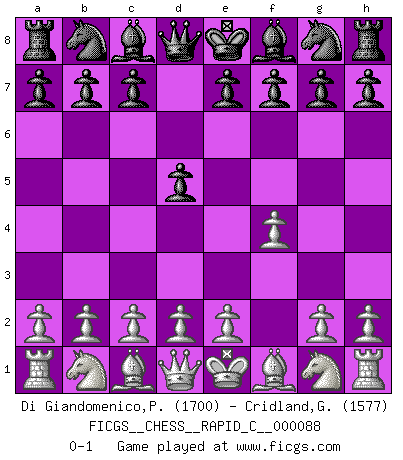 Last move : 0-1 2010 June 23 21:4:32 [Event "FICGS__CHESS__RAPID_C__000088"] [Site "FICGS"] [Date "2010.05.23"] [Round "1"] [White "Di Giandomenico,Pierino"] [Black "Cridland,Graham"] [Result "0-1"] [WhiteElo "1700"] [BlackElo "1577"] 1.f4 d5 0-1 This chess game has been lost on time (started : 2010.05.23 13:45:27) Bird's Opening Player Black won this chess game. Follow this game move after move (download)Any material change in a position must come about by mate, a capture, or a Pawn promotion. (Purdy) Wie ich sie so einen nach dem anderen nieder mähte wurde meine Überlegenheit offensichtlich. (José Raúl Capablanca) El Ajedrez es una hermosa aventura. (Bent Larsen) Les échecs c'est le défi de l'alpiniste, toujours plus haut, prêt à tout pour monter à l'assaut du Roi ennemi. Les échecs, c'est de la musique en mouvement, un ballet majestueux pour les yeux. C'est de la poésie composée par les fantômes du passé qui au même titre que Rimbaud ou Verlaine méritent notre admiration. Les échecs, c'est de la peinture ou le moindre mouvement modifie le tableau pour en faire un Picasso ou un Van Gogh. Les échecs, c'est tout et rien, c'est la vie et la mort. Jjulie33 sur le forum de France-Echecs. The problem with troubleshooting is that trouble shoots back. (Anonymous)