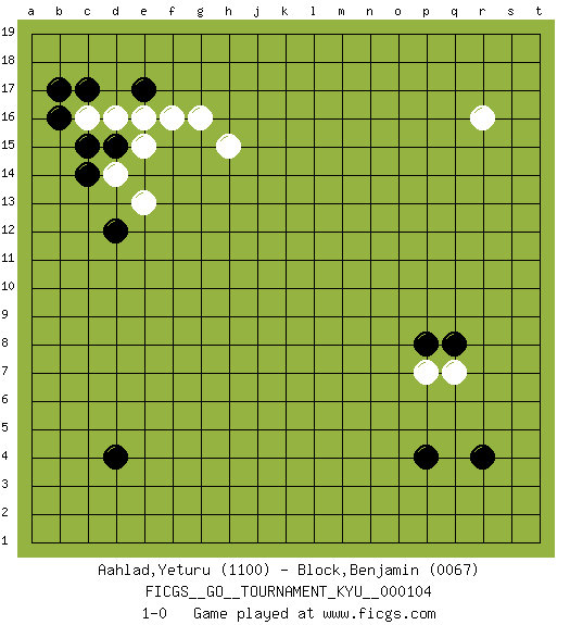 Last move : 1-0 2010 July 25 19:25:0 [Event "FICGS__GO__TOURNAMENT_KYU__000104"] [Site "FICGS"] [Date "2010.05.24"] [Round "1"] [Black "Aahlad,Yeturu"] [White "Block,Benjamin"] [Result "1-0"] [Rating 1 "1100"] [Rating 2 "0067"] 1.d4 c16 2.r4 r16 3.e17 g16 4.c14 h15 5.b17 d14 6.c17 d16 7.d15 e15 8.c15 e16 9.b16 f16 10.d12 e13 11.p4 q7 12.q8 p7 13.p8 1-0 Here are the names of the openings (joseki) played in the four corners : Corner d16 : c16 e17 Komoku (Somok, Xiao~mu`) 3-4 Point. The komoku (3-4) point is the traditional corner enclosure move.. Ikken Kakari (Hankan Keolch'im, Yi Gua`jiao~, 1-Space Low Pincer). The small knight move is the basic approach move to the 3-4 point stone. It has been continually used for over four centuries. There are limitless variations, with new moves constantly being discovered. Black 2 opens the door to a treaure store of joseki. Player Black won this Go (weiqi, baduk) game. Follow this game move after move (download)Go is to western chess what philosophy is to double entry accounting. (from Shibumi, by Trevanian) Art is not a thing, it is a way. (Elbert Hubbard)