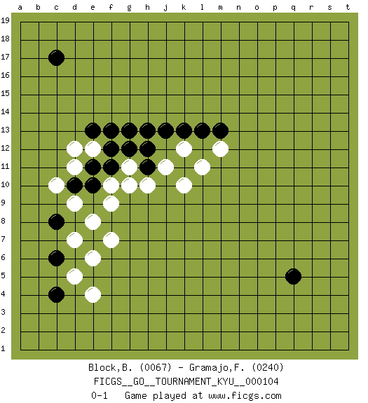 Last move : 0-1 2010 August 2 9:58:4 [Event "FICGS__GO__TOURNAMENT_KYU__000104"] [Site "FICGS"] [Date "2010.05.24"] [Round "1"] [Black "Block,Benjamin"] [White "Gramajo,Francisco"] [Result "0-1"] [Rating 1 "0067"] [Rating 2 "0240"] 1.c4 e4 2.q5 d5 3.c17 e6 4.c6 d7 5.c8 e8 6.d10 d9 7.e10 f9 8.e11 c10 9.f11 d11 10.f12 g11 11.f13 f7 12.g13 e12 13.e13 d12 14.h13 f10 15.h11 h10 16.g12 g10 17.h12 j11 18.j13 k10 19.k13 k12 20.l13 l11 21.m13 m12 0-1 This go game has been lost on time (started : 2010.05.24 5:20:8) Here are the names of the openings (joseki) played in the four corners : Corner d4 : c4 e4 Komoku (Somok, Xiao~mu`) 3-4 Point. The komoku (3-4) point is the traditional corner enclosure move.. Ikken Takagakari (Hankan Nop'dakeolch'im, Yi Gaogua`jiao~, 1-Space High Approach). The 5-4 approach move has become more popular in modern times, as modern Go emphasizes speed and influence. Corner q16 : l13 l11 This joseki is unknown. A weak or weird move has probably been played in this corner. Player White won this Go (weiqi, baduk) game. Follow this game move after move (download)Don't make dango's. (Anonymous) There is no vagueness without wind. (Chinese proverb)