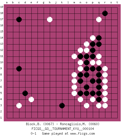 Last move : 0-1 2010 August 7 22:13:57 [Event "FICGS__GO__TOURNAMENT_KYU__000104 "] [Site "FICGS"] [Date "2010.05.24"] [Round "1"] [Black "Block,Benjamin "] [White "Roncagliolo,Marco "] [Result "0-1"] [Rating 1 "0067"] [Rating 2 "0060"] 1.c17 r3 2.c9 q17 3.k3 h17 4.r18 c3 5.d5 e4 6.q4 p4 7.q5 q3 8.p5 o3 9.o5 n4 10.n5 m5 11.n7 m6 12.o6 m7 13.n8 m8 14.o8 n9 15.p7 r4 16.p9 r5 17.q8 r6 18.q7 r7 19.q6 r8 20.q9 q10 21.o9 p10 22.o10 n10 23.o11 o12 24.n11 m11 25.p11 q11 26.p12 n12 27.p13 p14 28.q13 r9 29.q14 o13 0-1 This go game has been lost on time (started : 2010.05.24 5:20:8) Here are the names of the openings (joseki) played in the four corners : Corner d16 : c17 h17San-San (Sam-Sam, San-San) 3-3 Point. The San-San (3-3) point, emphasizing territory at the expense of influence. Corner q16 : q17 r18Komoku (Somok, Xiao~mu`) 3-4 Point. The komoku (3-4) point is the traditional corner enclosure move.. Corner d4 : c9 c3This joseki is unknown. A weak or weird move has probably been played in this corner. Corner q4 : r3 q4San-San (Sam-Sam, San-San) 3-3 Point. The San-San (3-3) point, emphasizing territory at the expense of influence.Kata-tsuki (shoulder hit). The shoulder-hit is the traditional answer to the 3-3. The direction of White 3 depends on the positions on the side. Crawling once may be the premise for a follow-up move of sliding with a knight's move in the opposite direction. If White plays 3 at 3-4 (to the right), the follow-on knight's move is then played at the top (e.g. 3-4, 4-5, 5-2). White's knight's move reduces territory potential on the side it is played. Player White won this Go (weiqi, baduk) game.Follow this game move after move (download ) The poor player plays the opponent's game for him. (Anonymous) He who is a good ruler must first have been ruled. (Aristotle)