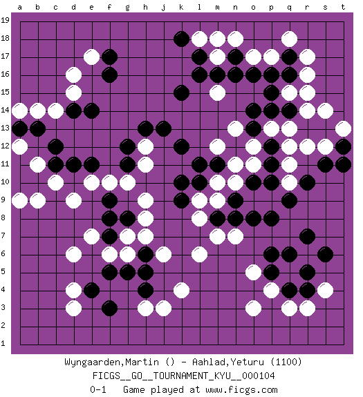 Last move : 0-1 2010 November 19 23:56:20 [Event "FICGS__GO__TOURNAMENT_KYU__000104"] [Site "FICGS"] [Date "2010.05.24"] [Round "1"] [Black "Wyngaarden,Martin"] [White "Aahlad,Yeturu"] [Result "0-1"] [Rating 2 "1100"] 1.q4 d16 2.q16 d4 3.f17 o3 4.p10 r6 5.p5 r3 6.r4 q3 7.r7 o5 8.p6 p4 9.q6 k4 10.s6 c10 11.m8 o17 12.r5 r14 13.p15 r17 14.d11 d9 15.c12 e17 16.f16 c14 17.f5 d6 18.e4 d3 19.q17 r16 20.r13 q15 21.n16 q18 22.o16 p17 23.p16 l6 24.k15 g7 25.g5 j6 26.h6 h7 27.f7 e7 28.f8 f6 29.k10 h9 30.f9 h11 31.j13 e10 32.e11 f10 33.q14 r15 34.g8 h8 35.f3 h3 36.h4 g6 37.h5 j3 38.g12 h12 39.h13 l9 40.k9 l8 41.l10 n7 42.n8 m7 43.e14 l18 44.k18 m17 45.n17 n18 46.l16 m9 47.n9 m10 48.m11 n10 49.o10 n11 50.n12 o11 51.p12 o12 52.o13 m12 53.l11 n13 54.b13 b14 55.d14 d15 56.g11 g10 57.k12 m15 58.m16 p13 59.o14 q13 60.p14 q12 61.p11 o9 62.o8 p9 63.q9 q10 64.p8 q11 65.r10 r12 66.s13 s12 67.t12 s14 68.t11 t13 69.s11 s4 70.l17 m18 71.b10 b9 72.a10 b11 73.a11 a12 74.c11 a9 75.a13 a14 0-1 Here are the names of the openings (joseki) played in the four corners : Corner d16 : d16 f17 Hoshi (Hwajeom, Seongjeom, Xingwei`) 4-4 Point. The star or hoshi (4-4) point, emphasizing influence at the potential expense of territory. Ikken Kakari (Hankan Keolch'im, Yi Gua`jiao~, 1-Space Low Approach). Black 2 is the standard approach move to the 4-4. Corner q4 : q4 o3 Hoshi (Hwajeom, Seongjeom, Xingwei`) 4-4 Point. The star or hoshi (4-4) point, emphasizing influence at the potential expense of territory. Ikken Kakari (Hankan Keolch'im, Yi Gua`jiao~, 1-Space Low Approach). White 2 is the standard approach move to the 4-4. Corner q16 : q16 o17 Hoshi (Hwajeom, Seongjeom, Xingwei`) 4-4 Point. The star or hoshi (4-4) point, emphasizing influence at the potential expense of territory. Ikken Kakari (Hankan Keolch'im, Yi Gua`jiao~, 1-Space Low Approach). White 2 is the standard approach move to the 4-4. Player White won this Go (weiqi, baduk) game. Follow this game move after move (download)Keep inessential ataris till the end. (Anonymous) O divine art of subtlety and secrecy! Through you we learn to be invisible, through you inaudible and hence we can hold the enemy's fate in our hands. (Sun Tzu)