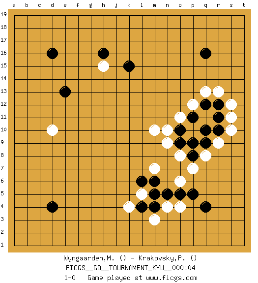 Last move : 1-0 2010 July 30 9:52:19 [Event "FICGS__GO__TOURNAMENT_KYU__000104"] [Site "FICGS"] [Date "2010.05.24"] [Round "1"] [Black "Wyngaarden,Martin"] [White "Krakovsky,Peter"] [Result "1-0"] 1.d16 h15 2.q4 o6 3.d4 d10 4.q16 n9 5.p9 m10 6.m5 p10 7.q9 q8 8.q10 q11 9.o9 o8 10.o10 o11 11.p11 p12 12.p8 p7 13.r11 p10 14.q12 q13 15.p11 n10 16.r12 r13 17.e13 r9 18.r10 s10 19.k15 s12 20.h16 s11 21.o5 o4 22.n5 n4 23.m4 m3 24.p5 l5 25.l4 k4 26.m6 m7 27.l6 1-0 This go game has been lost on time (started : 2010.05.24 5:20:8) Here are the names of the openings (joseki) played in the four corners : Corner d16 : d16 h15 Hoshi (Hwajeom, Seongjeom, Xingwei`) 4-4 Point. The star or hoshi (4-4) point, emphasizing influence at the potential expense of territory. Corner q4 : q4 o6 Hoshi (Hwajeom, Seongjeom, Xingwei`) 4-4 Point. The star or hoshi (4-4) point, emphasizing influence at the potential expense of territory. Corner q16 : q16 q11 Hoshi (Hwajeom, Seongjeom, Xingwei`) 4-4 Point. The star or hoshi (4-4) point, emphasizing influence at the potential expense of territory. Player Black won this Go (weiqi, baduk) game. Follow this game move after move (download)Fighting must not be the key to go, it should be reserved as your last resource. (Zhong-Pu Liu, about Weiqi) Think like a man of action, act like a man of thought. (Henri Louis Bergson)