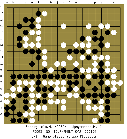 Last move : 0-1 2010 December 13 22:31:29 [Event "FICGS__GO__TOURNAMENT_KYU__000104"] [Site "FICGS"] [Date "2010.05.24"] [Round "1"] [Black "Roncagliolo,Marco"] [White "Wyngaarden,Martin"] [Result "0-1"] [Rating 1 "0060"] 1.d3 q16 2.c16 q4 3.r3 k3 4.r5 k16 5.e10 o9 6.r8 r9 7.q9 r10 8.p8 p9 9.q10 q11 10.q7 p10 11.q8 r11 12.n8 f5 13.p4 p3 14.p6 o3 15.o5 o4 16.p5 q3 17.r4 k7 18.l8 l11 19.j8 j7 20.m9 m10 21.m7 f13 22.k9 d16 23.d15 e15 24.e16 o8 25.o7 d14 26.d17 f16 27.e14 f15 28.c14 d13 29.d12 e13 30.c13 f14 31.e17 f17 32.f18 e3 33.d5 e6 34.e8 d7 35.d6 e7 36.d8 c7 37.b7 c6 38.c8 g10 39.c5 m5 40.l6 k6 41.k5 n13 42.f11 g11 43.g8 g7 44.f7 b6 45.b8 l5 46.j5 h4 47.g6 h7 48.f6 e5 49.g5 h5 50.g4 g3 51.f8 b5 52.d4 e4 53.b4 d2 54.c2 a4 55.a3 a5 56.b3 c1 57.b1 g18 58.f12 g12 59.e12 e2 60.d1 e1 61.c1 j10 62.g9 j4 63.f4 f3 64.h6 j6 65.n5 n4 66.r2 q2 67.q5 k4 68.q1 p1 69.r1 n9 70.m8 k10 71.h8 h9 72.k8 m6 73.l7 s9 74.n6 s8 75.s7 t7 76.r6 s6 77.a2 r7 78.s5 s7 79.r15 s15 80.q14 r16 81.p14 o14 82.q13 r13 83.p15 o16 84.p12 o12 85.o11 p11 86.n12 o13 87.n14 n11 88.m12 m13 89.l12 k13 0-1 This go game has been lost on time (started : 2010.05.24 5:20:8) Here are the names of the openings (joseki) played in the four corners : Corner q4 : q4 r3 Hoshi (Hwajeom, Seongjeom, Xingwei`) 4-4 Point. The star or hoshi (4-4) point, emphasizing influence at the potential expense of territory. Corner d4 : d3 f5 Komoku (Somok, Xiao~mu`) 3-4 Point. The komoku (3-4) point is the traditional corner enclosure move.. Corner d16 : c16 f13 Komoku (Somok, Xiao~mu`) 3-4 Point. The komoku (3-4) point is the traditional corner enclosure move.. Player White won this Go (weiqi, baduk) game. Follow this game move after move (download)Don't get surrounded ! Ever ! (Anonymous) Cactus - It is depressed cucumber. (Ilmars Cirulis)