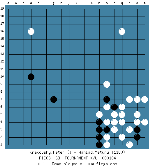 Last move : 0-1 2010 July 25 9:45:20 [Event "FICGS__GO__TOURNAMENT_KYU__000104"] [Site "FICGS"] [Date "2010.05.24"] [Round "1"] [Black "Krakovsky,Peter"] [White "Aahlad,Yeturu"] [Result "0-1"] [Rating 2 "1100"] 1.g7 q16 2.d10 p5 3.o5 q4 4.p6 q6 5.p4 q5 6.q3 o4 7.n4 p3 8.p2 o6 9.o3 p4 10.r4 r3 11.s3 q2 12.q1 o2 13.n3 r1 14.p1 s4 15.r5 s5 16.r6 r7 17.s6 s7 18.t6 t7 19.t5 t4 20.s2 n5 21.n2 o1 22.n1 d16 23.o7 o9 0-1 This go game has been lost on time (started : 2010.05.24 5:20:8) Here are the names of the openings (joseki) played in the four corners : Corner q4 : p5 o5 Go-no-go (Wu~wu~) 5-5 Point. The 5-5 was experimented with briefly during the "New Fuseki" movement in Japan in the 1930s. The 5-5 point has not retained popularity because the 4-4 hoshi (star) point strikes a better balance between influence and territory. As one can see from the variations, though, the 5-5 is playable. Player White won this Go (weiqi, baduk) game. Follow this game move after move (download)For rectangular six in the corner, dame is necessary. (Anonymous) Information on the Internet is subject to the same rules and regulations as conversation at a bar. (George Lundberg)