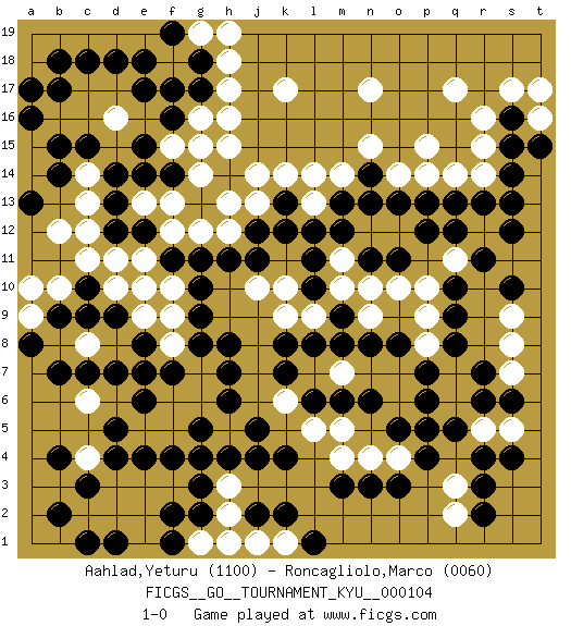 Last move : 1-0 2010 July 30 20:55:17 [Event "FICGS__GO__TOURNAMENT_KYU__000104"] [Site "FICGS"] [Date "2010.05.24"] [Round "1"] [Black "Aahlad,Yeturu"] [White "Roncagliolo,Marco"] [Result "1-0"] [Rating 1 "1100"] [Rating 2 "0060"] 1.d4 q17 2.r4 c16 3.p4 r15 4.e17 d15 5.c18 f15 6.g17 k17 7.b17 h17 8.g18 g16 9.f16 e16 10.f17 c17 11.d18 h18 12.q10 g19 13.f19 b16 14.a17 d17 15.e18 h19 16.c10 c11 17.d9 b10 18.b9 d10 19.c9 b12 20.d7 e10 21.k4 e9 22.e8 f8 23.f7 g7 24.g8 f9 25.h8 f6 26.e7 g5 27.h7 g6 28.e6 e5 29.d5 a9 30.a8 a10 31.b7 d3 32.e4 f5 33.h4 g4 34.g3 f3 35.f4 h3 36.g2 h5 37.j4 h2 38.j5 g1 39.f2 e3 40.h6 g4 41.g5 h1 42.c3 e2 43.f1 e1 44.g4 c2 45.d1 d2 46.b2 c4 47.c1 p15 48.r13 n17 49.p13 s17 50.h11 n15 51.n13 q14 52.q13 o14 53.o13 m14 54.l12 l13 55.m13 k14 56.k13 l14 57.j12 j13 58.k12 h13 59.f11 e11 60.g10 f12 61.s14 r14 62.s15 r16 63.s16 t16 64.s13 h12 65.t15 f10 66.g11 g12 67.k2 t17 68.a16 a15 69.b18 n12 70.n11 o12 71.o11 k10 72.j11 l9 73.b15 a14 74.c15 d16 75.g15 h16 76.d14 g14 77.f14 h15 78.e15 f13 79.e14 d16 80.g9 j10 81.e12 d11 82.d12 c12 83.b14 c13 84.a13 c14 85.l10 m10 86.l11 m11 87.m12 n10 88.m9 n9 89.m8 o10 90.p12 e13 91.d13 g15 92.p7 p9 93.q9 n7 94.n8 p8 95.o8 o7 96.q8 q7 97.p6 q11 98.l8 k9 99.k8 p10 100.r11 o6 101.o5 q6 102.p5 m7 103.l6 m4 104.m6 m5 105.m3 n4 106.n3 s7 107.s6 s8 108.r7 s9 109.r6 r5 110.q5 s5 111.s4 l7 112.k7 o4 113.o3 l5 114.s10 r12 115.s12 q2 116.r2 q3 117.r3 c6 118.b4 c8 119.c7 k1 120.l1 j1 121.j2 k6 122.n6 m7 123.n14 p14 124.q12 j14 125.pass pass 126.pass pass 1-0 Here are the names of the openings (joseki) played in the four corners : Corner d16 : c16 e17 Komoku (Somok, Xiao~mu`) 3-4 Point. The komoku (3-4) point is the traditional corner enclosure move.. Ikken Kakari (Hankan Keolch'im, Yi Gua`jiao~, 1-Space Low Pincer). The small knight move is the basic approach move to the 3-4 point stone. It has been continually used for over four centuries. There are limitless variations, with new moves constantly being discovered. Black 2 opens the door to a treaure store of joseki. Player Black won this Go (weiqi, baduk) game. Follow this game move after move (download)A meijin needs no joseki. (Anonymous) There are more things in heaven and earth than practically anywhere else. (Unknown)
