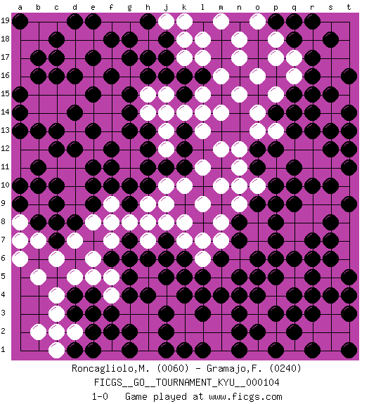 Last move : 1-0 2010 August 10 23:33:42 [Event "FICGS__GO__TOURNAMENT_KYU__000104"] [Site "FICGS"] [Date "2010.05.24"] [Round "1"] [Black "Roncagliolo,Marco"] [White "Gramajo,Francisco"] [Result "1-0"] [Rating 1 "0060"] [Rating 2 "0240"] 1.r17 p15 2.c17 r15 3.r3 p17 4.r19 p18 5.s15 q16 6.r14 o16 7.r16 q14 8.q15 o14 9.r15 p13 10.q13 q12 11.p14 r12 12.q14 q19 13.s12 s11 14.s13 t10 15.t14 o19 16.t16 t12 17.t13 n17 18.t11 n18 19.q18 q17 20.p19 n15 21.q19 m19 22.t12 m16 23.s10 r11 24.t9 s9 25.s8 r9 26.r10 r8 27.r7 q7 28.s6 r6 29.s7 s5 30.r5 q5 31.q6 p6 32.r6 r4 33.s4 s3 34.q4 q3 35.p5 p4 36.p7 q8 37.o6 o5 38.q10 p9 39.p10 o10 40.p8 o8 41.q9 n6 42.o9 n9 43.p9 o7 44.p6 p11 45.o11 n10 46.o12 n11 47.p12 n12 48.q11 o13 49.r13 t4 50.t5 t2 51.t3 s2 52.t4 r2 53.r4 p2 54.o4 r18 55.p3 q1 56.q2 o3 57.q3 n4 58.n5 m5 59.o5 m7 60.s18 m8 61.o2 o1 62.n3 m3 63.n1 m2 64.p1 m1 65.m4 l4 66.n4 l6 67.k4 k5 68.l3 k3 69.l5 k7 70.m6 l9 71.n7 k8 72.n8 m10 73.j3 k2 74.j2 j4 75.l4 j6 76.k1 l2 77.j1 h1 78.l1 h2 79.n2 h3 80.h4 h5 81.j5 h7 82.k6 l7 83.g4 g6 84.k5 j8 85.g5 g3 86.f3 f4 87.h6 f5 88.j7 g8 89.e4 e3 90.f2 e5 91.d4 c4 92.d3 d5 93.e2 d2 94.g2 c3 95.g1 e1 96.e3 c1 97.f6 f7 98.g7 j6 99.g6 e6 100.j7 h8 101.j6 j9 102.e15 c6 103.g13 e8 104.j11 k10 105.h10 l17 106.g9 f9 107.g10 h9 108.f10 j10 109.k11 l11 110.e9 f8 111.d8 d9 112.e10 d7 113.c8 h11 114.h12 g11 115.c9 d10 116.f11 g12 117.f12 m12 118.c10 d11 119.d12 e12 120.e13 d13 121.e11 c11 122.c12 b12 123.b11 b5 124.c7 b7 125.b8 a8 126.a9 a7 127.b10 a11 128.b13 a12 129.a13 l18 130.a10 m14 131.k12 l13 132.k13 k14 133.k15 l15 134.j14 l14 135.k16 k17 136.l16 k18 137.j17 j19 138.j18 h18 139.h17 g18 140.f18 f19 141.e19 g19 142.g17 f17 143.h19 k19 144.f16 b2 145.e17 a6 146.r1 s1 147.t1 f1 148.d1 c2 149.e1 b15 150.d14 c14 151.c13 d15 152.d16 c15 153.c16 b14 154.b16 b18 155.a15 a16 156.a14 a17 157.c18 c19 158.d19 b19 159.b17 a18 160.a19 h18 161.g18 j15 162.j16 h15 163.g15 h14 164.h13 j13 165.g14 j14 166.h16 j12 167.h11 1-0 Here are the names of the openings (joseki) played in the four corners : Corner q16 : r17 p15 San-San (Sam-Sam, San-San) 3-3 Point. The San-San (3-3) point, emphasizing territory at the expense of influence. Player Black won this Go (weiqi, baduk) game. Follow this game move after move (download)The simplest move is the best move. (Anonymous) An expert is a man who has made all the mistakes which can be made in a very narrow field. (Niels Bohr)