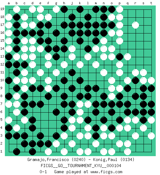 Last move : 0-1 2010 September 4 0:6:38 [Event "FICGS__GO__TOURNAMENT_KYU__000104"] [Site "FICGS"] [Date "2010.05.24"] [Round "1"] [Black "Gramajo,Francisco"] [White "Konig,Paul"] [Result "0-1"] [Rating 1 "0240"] [Rating 2 "0134"] 1.k10 k12 2.j11 h12 3.h10 q10 4.j9 j13 5.h8 g11 6.g9 f10 7.e9 d10 8.d9 f9 9.f8 c9 10.c8 b8 11.b9 c10 12.a8 b7 13.c7 b6 14.b5 a7 15.c6 a5 16.a4 b10 17.a10 b4 18.a3 a2 19.b3 c5 20.d5 b2 21.c3 d3 22.c2 c1 23.d1 a1 24.d4 e1 25.e2 f1 26.f2 e8 27.e7 d8 28.d7 h1 29.e3 q4 30.b11 e11 31.d2 g2 32.g3 h3 33.h4 j2 34.j3 j4 35.k3 l3 36.k4 j5 37.h5 h6 38.j6 k5 39.l5 k6 40.j7 k7 41.l8 l7 42.m7 l4 43.k2 k1 44.l2 m2 45.m3 l1 46.m4 n3 47.n5 a12 48.m6 a11 49.b12 b13 50.a13 a14 51.a12 c13 52.d13 d14 53.c12 d12 54.e12 c11 55.e13 e14 56.f14 f13 57.g13 f12 58.k8 k3 59.n2 n1 60.o2 o3 61.p3 p2 62.p1 o1 63.b14 a15 64.b15 a16 65.b16 a17 66.b17 a18 67.b18 b19 68.c19 c18 69.d19 e19 70.d18 c17 71.c16 d17 72.d16 e18 73.e17 e16 74.f17 d15 75.e15 f16 76.g16 c15 77.f15 p4 78.d18 d19 79.g6 c14 80.q3 q1 81.l9 r3 82.h14 q2 83.h15 j14 84.g14 d13 85.e16 t7 86.o6 p7 87.o7 o8 88.n8 r17 89.b1 k16 90.j16 j17 91.h17 l17 92.j18 k18 93.k17 l19 94.j17 l15 95.k15 m16 96.l16 m18 97.k16 m14 98.m9 n11 99.l14 n15 100.m15 o13 101.n16 n17 102.m17 n19 103.n18 o18 104.l18 j19 105.l17 l13 106.m13 n14 107.m16 m12 108.o17 o16 109.n18 n13 110.n17 p19 111.o15 p16 112.h19 g19 113.k19 f18 114.m19 p15 115.o19 p18 116.n19 p17 117.p8 o9 118.q7 p6 119.p5 q5 120.q6 o10 121.p7 p9 122.n7 p11 123.q9 r9 124.p13 o14 125.r8 s10 126.s8 s6 127.t9 t5 128.g1 f1 129.s7 t8 130.t6 r5 131.t7 r11 132.r6 s4 133.s5 t3 134.s6 t10 135.s9 q13 136.r10 s11 137.h7 p12 138.o4 n4 0-1 Here are the names of the openings (joseki) played in the four corners : Corner d16 : j11 h12 This joseki is unknown. A weak or weird move has probably been played in this corner. Player White won this Go (weiqi, baduk) game. Follow this game move after move (download)Take the cutting stone on the second line. (Anonymous) Whoever said the pen is mightier than the sword obviously never encountered automatic weapons. (US General Douglas MacArthur)