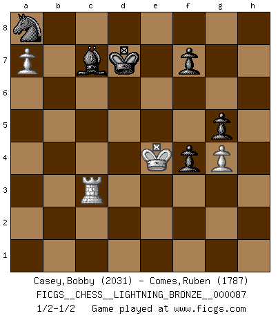 Last move : 1/2-1/2 2010 May 24 10:24:24 [Event "FICGS__CHESS__LIGHTNING_BRONZE__000087"] [Site "FICGS"] [Date "2010.05.24"] [Round "1"] [White "Casey,Bobby"] [Black "Comes,Ruben"] [Result "1/2-1/2"] [WhiteElo "2031"] [BlackElo "1787"] 1.e4 c5 2.Nf3 d6 3.d4 cxd4 4.Nxd4 Nf6 5.Nc3 a6 6.h3 e6 7.g4 h6 8.Bg2 Be7 9.Be3 Nc6 10.f4 Nd7 11.Qd2 Nxd4 12.Bxd4 e5 13.Bf2 exf4 14.Nd5 Bg5 15.Qb4 O-O 16.Qxd6 Re8 17.O-O Re6 18.Qb4 a5 19.Qb3 b6 20.Rfd1 Bb7 21.c4 Rc8 22.e5 Ba8 23.Nxb6 Rxb6 24.Bxb6 Qxb6+ 25.Qxb6 Nxb6 26.Bxa8 Rxa8 27.c5 Nc4 28.Rac1 Nxe5 29.c6 Rc8 30.c7 Bf6 31.Rd5 Kf8 32.Rxa5 Ke7 33.Rd5 Nf3+ 34.Kf2 Ng5 35.b4 Bc3 36.h4 Ne4+ 37.Kf3 Nf6 38.Rd8 Rxc7 39.Rd3 Be5 40.Rxc7+ Bxc7 41.a4 Nd7 42.Rc3 Bd6 43.b5 g5 44.hxg5 hxg5 45.b6 Nxb6 46.a5 Na8 47.a6 Kd7 48.a7 Bc7 49.Ke4 1/2-1/2 Sicilian : Najdorf, Adams attack Kingside Castling by player Black (move 15) Kingside Castling by player White (move 17) 10 pieces endgame at move 45 : White KRPP , Black KBNPPP WHITE : King + 1 Rook 2 Pawns BLACK : King + 1 Bishop 1 Knight 3 Pawns This chess game ended in a draw. Follow this game move after move (download)As one by one I mowed them down, my superiority soon became apparent. (Jose Capablanca) Bis jetzt ist Weiß einer wohlbekannten Analyse gefolgt. Aber jetzt begeht er einen schrecklichen Fehler: Er beginnt seinen eigenen Kopf zu benutzen. (Siegbert Tarrasch) Un mal día en el Ajedrez, es mejor que cualquier buen día en el trabajo. (Anonymous) On n'a jamais que l'âge auquel on a commence à jouer aux échecs car après on cesse de vieillir. (Capablanca) Nowadays, anyone who cannot speak English and is incapable of using the Internet is regarded as backward. (Al-Waleed bin Talal)