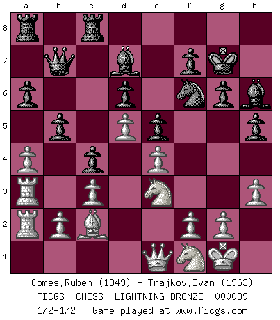 Last move : 1/2-1/2 2010 May 24 12:46:35 [Event "FICGS__CHESS__LIGHTNING_BRONZE__000089"] [Site "FICGS"] [Date "2010.05.24"] [Round "1"] [White "Comes,Ruben"] [Black "Trajkov,Ivan"] [Result "1/2-1/2"] [WhiteElo "1849"] [BlackElo "1963"] 1.e4 e5 2.Nf3 Nc6 3.Bb5 a6 4.Ba4 Nf6 5.O-O Be7 6.Re1 b5 7.Bb3 d6 8.c3 O-O 9.h3 Bb7 10.d4 Re8 11.Nbd2 Bf8 12.a3 h6 13.Ba2 Nb8 14.Bb1 Nbd7 15.Bc2 c5 16.d5 c4 17.Nf1 Nc5 18.Ng3 Bc8 19.Be3 Qc7 20.a4 Bd7 21.Nd2 g6 22.Qf3 Bg7 23.Ngf1 Kh7 24.Bxc5 Qxc5 25.Ra3 Reb8 26.Rea1 Qc8 27.R1a2 h5 28.Qd1 Ne8 29.Qa1 Nc7 30.Qd1 Bh6 31.Ne3 Kg7 32.Qf1 Qb7 33.Ra1 Ne8 34.Qe1 Nf6 35.R1a2 Rc8 36.Ndf1 1/2-1/2 Ruy Lopez : Closed Kingside Castling by player White (move 5) Kingside Castling by player Black (move 8) This chess game ended in a draw. Follow this game move after move (download)Chess is so inspiring that I do not believe a good player is capable of having an evil thought during the game. (Wilhelm Steinitz) Es hat in meinem Leben Zeiten gegeben, in denen das Schachspiel, wenn nicht zum Lebenszweck, so doch zu einem regelrechten Lebensersatz geworden ist. Man fühlt sich in solchen Zeiten nicht so, als besäße man eine göttliche Gabe, sondern eher so, als sei man von ihr besessen. (Garry Kasparov) Las piezas de Ajedrez son los bloques del alfabeto que moldean los pensamientos; y esos pensamientos, aunque hagan un diseño visual en el tablero, expresan abstractamente su belleza como un poema. (Marcel Duchamp) Si rien de grave n'est détecté lors de l'analyse d'une position, on joue alors le coup. Seconde règle de Blumenfeld. Even the best needles are not sharp at both ends. (Chinese proverb)