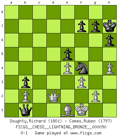Last move : 0-1 2010 May 25 4:2:12 [Event "FICGS__CHESS__LIGHTNING_BRONZE__000090"] [Site "FICGS"] [Date "2010.05.25"] [Round "1"] [White "Doughty,Richard"] [Black "Comes,Ruben"] [Result "0-1"] [WhiteElo "1801"] [BlackElo "1797"] 1.Nf3 c5 2.Nc3 Nc6 3.e4 e6 4.d4 cxd4 5.Nxd4 Nf6 6.Ndb5 d6 7.Bf4 e5 8.Bg5 a6 9.Na3 b5 10.Nd5 Be7 11.Nxe7 Qxe7 12.c4 Nd4 13.Nc2 Nxc2+ 14.Qxc2 Bd7 15.cxb5 axb5 16.Bd3 h6 17.Bd2 O-O 18.O-O Rfc8 19.Qd1 Bc6 20.Qe2 Qe6 21.f3 Rxa2 22.Bc3 Rxa1 23.Rxa1 Rb8 24.Ra7 b4 25.Be1 Nh5 26.Qd2 Nf4 27.Ra6 Qe8 28.Ra1 Bb5 29.Bxb5 Qxb5 30.Qxd6 Rb7 31.Qd8+ Kh7 32.Qd2 Rd7 33.Qf2 b3 34.h3 Qc4 35.h4 Qc2 36.Kf1 Rd1 37.Rxd1 Qxd1 38.Qd2 Qb1 0-1 Reti Opening Kingside Castling by player Black (move 17) Kingside Castling by player White (move 18) Player Black won this chess game. Follow this game move after move (download)Help your pieces so they can help you. (Paul Morphy) Das Schach hält seine Meister in eigenen Banden, Fesseln; auf vielerlei Weise formt es ihren Geist, so dass die innere Freiheit selbst des Stärksten beeinflusst wird. (Albert Einstein) El Ajedrez es un juego de pelea el cual es puramente intelectual e incluye la suerte. (Richard Reti) Le plus grand jeu de l'esprit jamais inventé, plus vous l'apprenez, plus vous y prenez du plaisir. (Garry Kasparov) The Movers & Shakers of this world are those who play chess in the mornings and go to the disco in the evenings. (Dinesh De Silva)