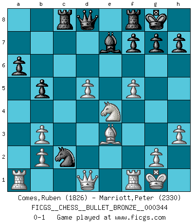 Last move : 0-1 2010 May 25 7:4:49 [Event "FICGS__CHESS__BULLET_BRONZE__000344"] [Site "FICGS"] [Date "2010.05.25"] [Round "1"] [White "Comes,Ruben"] [Black "Marriott,Peter"] [Result "0-1"] [WhiteElo "1826"] [BlackElo "2330"] 1.e4 c5 2.Nf3 d6 3.d4 cxd4 4.Nxd4 Nf6 5.Nc3 a6 6.h3 e5 7.Nb3 Be6 8.f4 Nc6 9.f5 Bxb3 10.axb3 Be7 11.Be3 Nb4 12.Bc4 O-O 13.O-O b5 14.Be2 Rc8 15.Bf3 d5 16.exd5 e4 17.Bxe4 Nxe4 18.Nxe4 Nxc2 0-1 Sicilian : Najdorf, Adams attack Kingside Castling by player Black (move 12) Kingside Castling by player White (move 13) Player Black won this chess game. Follow this game move after move (download)Chess mastery essentially consists of analyzing Chess positions accurately. (Mikhail Botvinnik) Die Elozahlen sind sehr schlecht für das Schach. Jetzt ist Schach eine Sportindustrie, die darauf zielt Elopunkte zu machen. (Miguel Najdorf) En la perfecta combinación de Ajedrez como en una historia corta de primera clase, toda la trama y contra trama deberá conducir hacia un final sorprendente, el interes no es mitigado hasta el último momento. (Yates and Winter) Les échecs sont utiles à l'exercice de la faculté de penser et à celle de l'imagination. Car nous devons posséder une méthode élaborée pour atteindre des buts partout où nous devons conduire notre raison. (Leibnitz) Nobody is always a winner, and anybody who says he is, is either a liar or doesn't play poker. (Amarillo Slim)