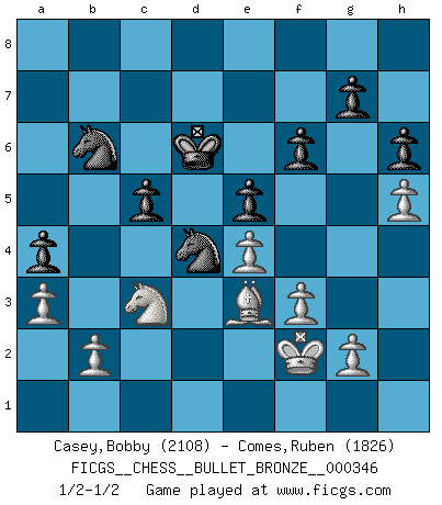Last move : 1/2-1/2 2010 May 25 8:20:16 [Event "FICGS__CHESS__BULLET_BRONZE__000346"] [Site "FICGS"] [Date "2010.05.25"] [Round "1"] [White "Casey,Bobby"] [Black "Comes,Ruben"] [Result "1/2-1/2"] [WhiteElo "2108"] [BlackElo "1826"] 1.d4 Nf6 2.c4 c6 3.Nf3 d5 4.Nc3 e6 5.e3 Nbd7 6.Bd3 dxc4 7.Bxc4 b5 8.Be2 Bb7 9.O-O b4 10.Na4 Be7 11.a3 a5 12.Qc2 O-O 13.Rd1 Qb8 14.Nc5 Bxc5 15.dxc5 b3 16.Qxb3 Ba6 17.Qxb8 Rfxb8 18.Bxa6 Rxa6 19.Rb1 Nxc5 20.Bd2 Nd5 21.Be1 h6 22.Ne5 f6 23.Nc4 Nb3 24.f3 e5 25.Bc3 a4 26.Be1 Kf7 27.Kf2 Ke7 28.e4 Nb6 29.Ne3 c5 30.h4 Ra7 31.h5 Kf7 32.Rd3 Rd7 33.Rxd7+ Nxd7 34.Nc4 Nb6 35.Ne3 Nc8 36.Nd1 Rb7 37.Nc3 Nb6 38.Rd1 Ke8 39.Kg3 Ra7 40.Nb5 Rd7 41.Nc3 Rxd1 42.Nxd1 Nc4 43.Bf2 Nd4 44.Be3 Kd7 45.Kf2 Ke6 46.Bc1 Ke7 47.Be3 Kd7 48.Bc1 Kc6 49.Ke1 Nb6 50.Nc3 Kd6 51.Kf2 Nb3 52.Be3 Nd4 1/2-1/2 Queen's pawn game Kingside Castling by player White (move 9) Kingside Castling by player Black (move 12) This chess game ended in a draw. Follow this game move after move (download)Alekhine is a poet who creates a work of art out of something that would hardly inspire another man to send home a picture post card. (Max Euwe) Rauchen ist dem Schachspieler bei seiner Arbeit, also im Wettkampf, untersagt. (Viktor Kortschnoi) Ciertamente el estado mental actual de Bobby Fischer es una tragedia. Uno de los mas grandes jugadores de Ajedrez del mundo -el orgullo y pena del Ajedrez Americano. (Frank Brady) La tactique est l'élément le plus important du milieu de jeu. (Siegbert Tarrasch) Only sick music makes money today. (Friedrich Nietzsche)