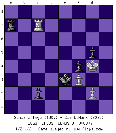 Last move : 1/2-1/2 2007 July 28 2:50:54 [Event "FICGS__CHESS__CLASS_B__000007"] [Site "FICGS"] [Date "2006.11.03"] [Round "1"] [White "Schwarz,Ingo"] [Black "Clark,Mark"] [Result "1/2-1/2"] [WhiteElo "1807"] [BlackElo "2073"] 1.e4 Nc6 2.Bc4 e5 3.Nf3 Bc5 4.c3 Nf6 5.d4 Bd6 6.dxe5 Bxe5 7.Nxe5 Nxe5 8.Bd3 O-O 9.O-O d5 10.exd5 Qxd5 11.Bc2 Qc6 12.Re1 Bg4 13.f3 Rad8 14.Nd2 Qc5+ 15.Kh1 Bh5 16.Qe2 Rfe8 17.Ne4 Nxe4 18.Bxe4 Nd3 19.Be3 Qc4 20.Bxd3 Rxd3 21.Qf2 b6 22.Bd4 f6 23.b3 Qd5 24.Rxe8+ Bxe8 25.Re1 Bg6 26.Qg3 Qd7 27.h4 c5 28.Bxf6 gxf6 29.h5 Kf7 30.hxg6+ hxg6 31.Rc1 Rd2 32.Ra1 g5 33.Qe1 Qd3 34.c4 Qc2 35.Qf1 Qh7+ 36.Kg1 Qh4 37.a3 Qd4+ 38.Kh1 f5 39.b4 Qb2 40.bxc5 bxc5 41.Rb1 Qh8+ 42.Kg1 Kg6 43.Qe1 Qd4+ 44.Kh2 Kf6 45.Rb7 Qd6+ 46.Qg3 Qxg3+ 47.Kxg3 f4+ 48.Kh3 Rd4 49.Rxa7 Rxc4 50.a4 Rc1 51.Kh2 c4 52.Rc7 Ke5 53.a5 Kd4 54.a6 Ra1 55.a7 c3 56.Kh3 Kd3 57.Rd7+ Ke3 58.Rc7 Kd2 59.Rd7+ Kc1 60.Rc7 c2 61.Kg4 Ra5 62.Rb7 Kd2 63.Rd7+ Ke3 64.Rc7 Rxa7 1/2-1/2 KP : Nimzovich defense Kingside Castling by player Black (move 8) Kingside Castling by player White (move 9) 10 pieces endgame at move 49 : White KRPPP , Black KRPPP WHITE : King + 1 Rook 3 Pawns BLACK : King + 1 Rook 3 Pawns 9 pieces endgame at move 64 : White KRPP , Black KRPPP WHITE : King + 1 Rook 2 Pawns BLACK : King + 1 Rook 3 Pawns This chess game ended in a draw. Follow this game move after move (download)I have never in my life played the French Defence, which is the dullest of all openings. (Wilhelm Steinitz) Nicht daß Diemer aus Opportunismus Mitglied der NSDAP geworden wäre. Er war ein Fanatiker, in allem, was er tat. (Hans Ree) En la vida, como en el Ajedrez, los Peones propios obstruyen nuestro camino. La gran fortuna de un hombre, su comodidad, placer, hijos, libros, que deberían ayudarle a ganar, con mucha frecuencia lo ponen en Jaque Mate. (Charles Buxton) J'ai toujours senti une vague pitié pour l'homme qui ne connaît rien aux échecs, tout comme j'en aurais pour un homme ignorant de l'amour. Les Echecs, comme la musique ou comme l'amour, ont le pouvoir de rendre heureux. (Siegbert Tarrasch) I believe in luck. How else can you explain the success of those you dislike ? (Jean Cocteau)