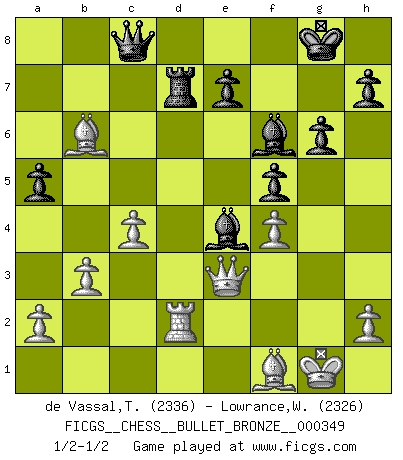 Last move : 1/2-1/2 2010 May 25 19:45:10 [Event "FICGS__CHESS__BULLET_BRONZE__000349"] [Site "FICGS"] [Date "2010.05.25"] [Round "1"] [White "de Vassal,Thibault"] [Black "Lowrance,Wayne"] [Result "1/2-1/2"] [WhiteElo "2336"] [BlackElo "2326"] 1.e4 c5 2.Nf3 d6 3.d4 cxd4 4.Nxd4 Bd7 5.c4 Nf6 6.Nc3 g6 7.Be2 Bg7 8.O-O O-O 9.Be3 Nc6 10.Qd2 Nxd4 11.Bxd4 Bc6 12.f3 Nd7 13.Be3 a5 14.b3 Nc5 15.Rab1 Qb6 16.Rfc1 Rfc8 17.Rc2 Qd8 18.Bf1 Be5 19.Nd1 Rc7 20.Nf2 Bg7 21.g3 Qf8 22.Nd3 b6 23.Qf2 Rac8 24.Rbc1 Rd8 25.Rd1 f5 26.e5 dxe5 27.Rcd2 Rd4 28.Re1 Rd6 29.Nxc5 bxc5 30.Red1 Rd4 31.f4 Rxd2 32.Rxd2 exf4 33.gxf4 Bc3 34.Rd1 Qc8 35.Bxc5 Be4 36.Qe3 Bf6 37.Bb6 Rd7 38.Rd2 1/2-1/2 Sicilian Kingside Castling by player White (move 8) Kingside Castling by player Black (move 8) This chess game ended in a draw. Follow this game move after move (download)Chess is above all, a fight ! (Emanuel Lasker) Woher wissen wir, daß der Neanderthaler Blindschach gespielt hat? -- Bei Ausgrabungen wurden keine Schachbretter und Figuren gefunden. (Anonymous) Cuando la partida de Ajedrez termina, el Peón y el Rey regresan a la misma caja. (Irish saying) Les Echecs, c'est l'art de la guerre sans les charniers, c'est la résurrection des morts tombés au champ d'honneur, l'espoir perpétuel, la suprématie de l'intelligence sur la force, la culture de l'esprit. (F. Szpiner) Fame, I have already. Now I need the money. (an elderly Steinitz)