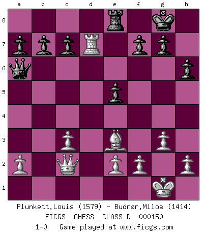 Last move : 1-0 2010 September 18 16:54:40 [Event "FICGS__CHESS__CLASS_D__000150"] [Site "FICGS"] [Date "2010.05.25"] [Round "1"] [White "Plunkett,Louis"] [Black "Budnar,Milos"] [Result "1-0"] [WhiteElo "1579"] [BlackElo "1414"] 1.d4 d5 2.c4 e6 3.g3 dxc4 4.Nf3 Nf6 5.Qa4+ Nc6 6.Qxc4 Bb4+ 7.Nc3 O-O 8.Bg2 Bxc3 9.bxc3 h6 10.Qd3 Qd5 11.O-O Qf5 12.Qd1 Bd7 13.Nh4 Qb5 14.Qc2 e5 15.Rb1 Qa6 16.Rd1 Be6 17.d5 Bxd5 18.Bxd5 Nxd5 19.Rxd5 Rad8 20.Rxd8 Rxd8 21.Nf5 Rd7 22.Be3 Ne7 23.Nxe7+ Rxe7 24.Rd1 Re8 25.Rd7 1-0 Queen's gambit declined Kingside Castling by player Black (move 7) Kingside Castling by player White (move 11) Player White won this chess game. Follow this game move after move (download)What would Chess be without silly mistakes ? (Kurt Richter) Es hat in meinem Leben Zeiten gegeben, da ich sehr nahe daran war zu glauben, daß ich auch nicht eine einzige Schachpartie verlieren könnte. (José Raúl Capablanca) Estaba muy claro de que el punto vulnerable del Gran Maestro Americano (Bobby Fischer) radicaba en las posiciones de doble filo, colgantes, irracionales, donde el siempre falló en encontrar un triunfo aún en una posición de clara victoria. (Efim Geller) Le joueur d'Echecs qui veut atteindre le top est obligé de développer son propre credo créatif. Alexeï Stepanovicth Souétine. Il est facile d'écrire des livres ! Ce qui est difficile, c'est de jouer ! (Alexeï Stepanovicth Souétine) Dave, my mind is going. I can feel it. (HAL 9000 in 2001, a space odyssey)