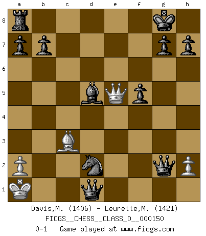 Last move : 0-1 2010 August 4 2:47:22 [Event "FICGS__CHESS__CLASS_D__000150"] [Site "FICGS"] [Date "2010.05.25"] [Round "1"] [White "Davis,Mark"] [Black "Leurette,Marc-Antoine"] [Result "0-1"] [WhiteElo "1406"] [BlackElo "1421"] 1.e4 e5 2.Nf3 Nc6 3.b3 Bc5 4.Bb2 Nf6 5.Nc3 Ng4 6.Be2 Nxf2 7.Qc1 Nxh1 8.d4 exd4 9.Nd5 O-O 10.Qf4 f5 11.O-O-O Nf2 12.Rf1 Bd6 13.e5 Nxe5 14.Nxe5 Bxe5 15.Qxe5 Qg5+ 16.Kb1 d6 17.Qxd4 Ne4 18.Bc1 Qd8 19.Bb2 Qg5 20.Rg1 c5 21.Qa4 Nd2+ 22.Ka1 Be6 23.Nc7 Qe3 24.Re1 Qf2 25.Rc1 Qxe2 26.Nxa8 Rxa8 27.Qh4 Qxg2 28.Qe7 Bd5 29.Qxd6 c4 30.Qe5 cxb3 31.Rd1 bxc2 32.Bc3 cxd1Q+ 0-1 King's pawn game Kingside Castling by player Black (move 9) Queenside Castling by player White (move 11) Promotion Queen by player Black (move 32) Player Black won this chess game. Follow this game move after move (download)That's what Chess is all about. One day you give your opponent a lesson, the next day he gives you one. (Bobby Fischer) Schach ist ein schwarz-weisser Dschungel. (Garry Kasparov) Desconfianza es la característica mas necesaria de un jugador de Ajedrez. (Siegbert Tarrasch) RxDa4 pat (...) Wisdom begins at the end. (Daniel Webster)